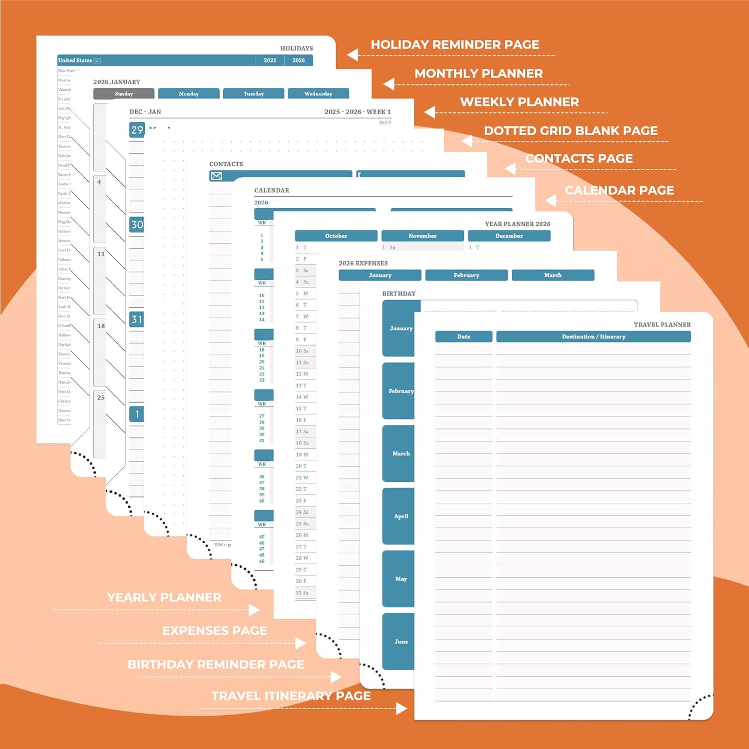 - Multi function Page: Personalized planner system. Year plan pages, holiday reminders, birthday record area for relatives and friends; set up storage contacts, and record inspiration and plans with the dot matrix note area; at the same time, work planner can travel planning and expense management modules to achieve coordination of schedule and finance