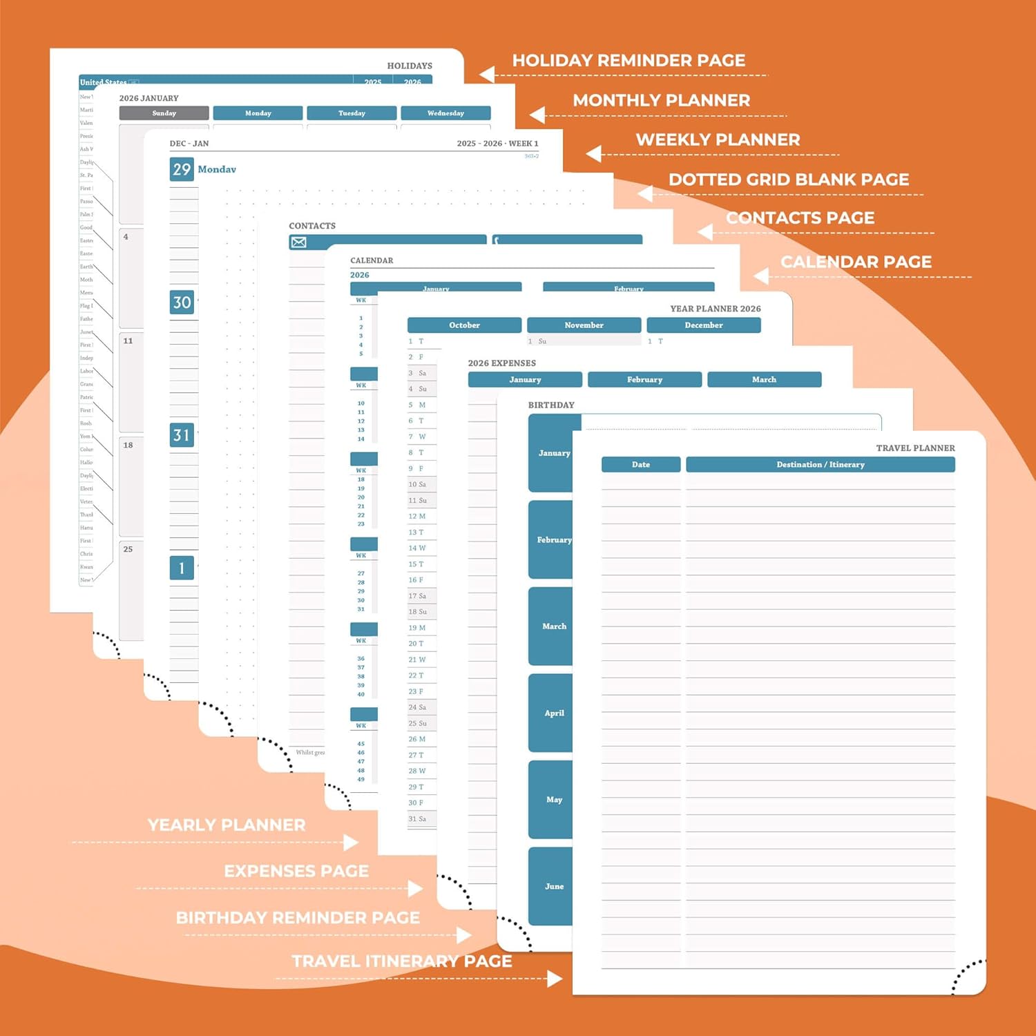 - Multi function Page: Personalized planner system. Year plan pages, holiday reminders, birthday record area for relatives and friends; set up storage contacts, and record inspiration and plans with the dot matrix note area; at the same time, work planner can travel planning and expense management modules to achieve coordination of schedule and finance