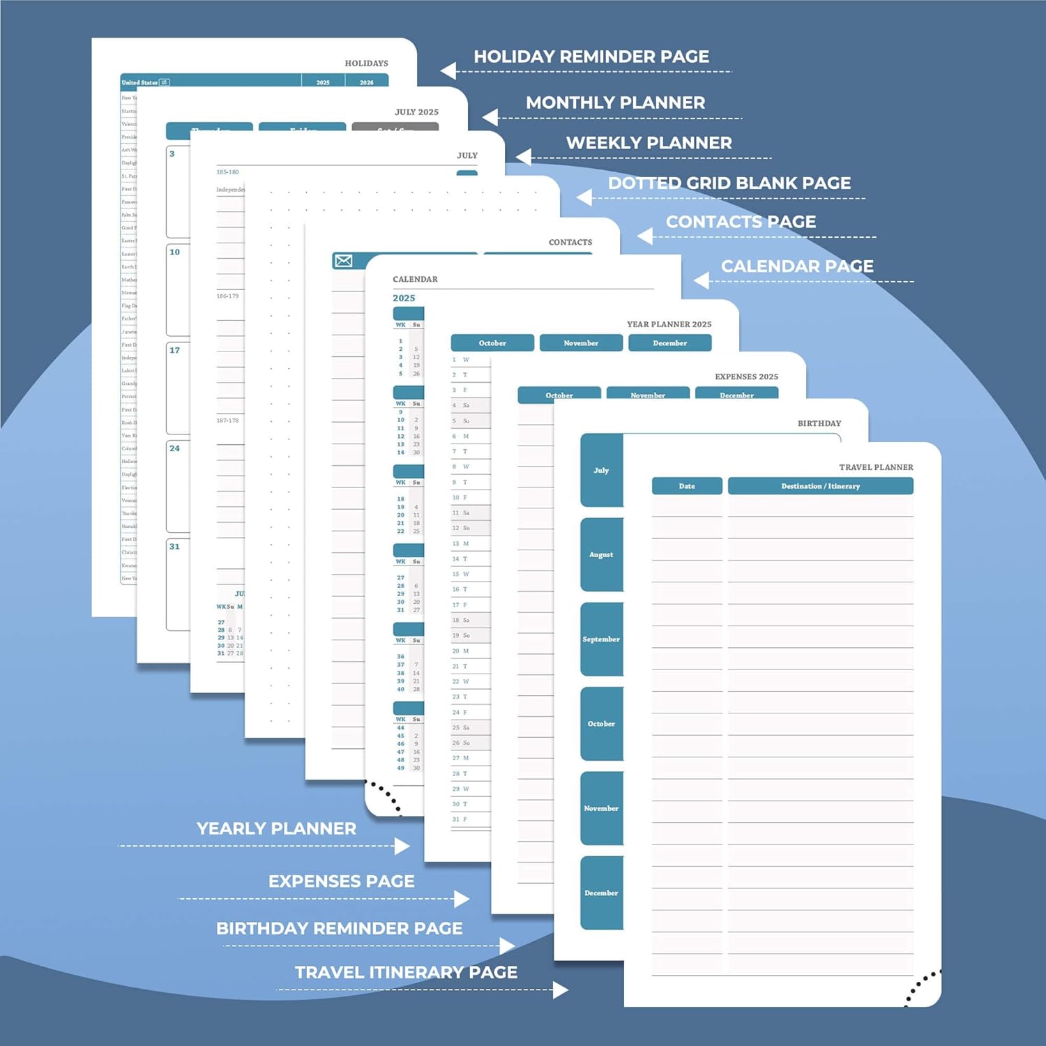 - Multi function Page: Personalized planner system. Year plan pages, holiday reminders, birthday record area for relatives and friends; set up storage contacts, and record inspiration and plans with the dot matrix note area; at the same time, work planner can travel planning and expense management modules to achieve coordination of schedule and finance