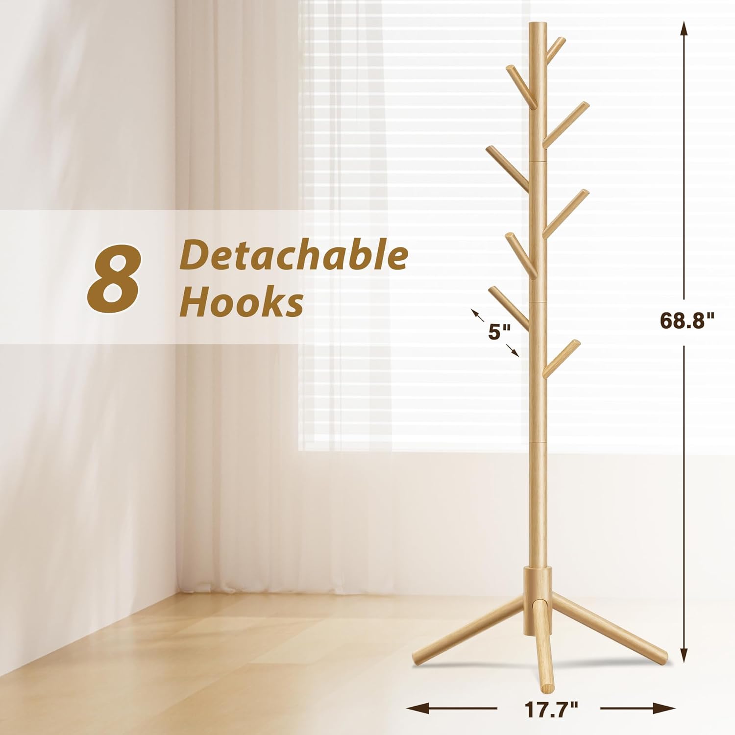 Wooden Coat Rack, Free Standing Coat Rack with 8 Hooks 3 Adjustable Heights for Clothes, Hats, Handbags, Coat Tree Easy Assembly for Entryway, Bedroom, Hallway, Office(2PCS)