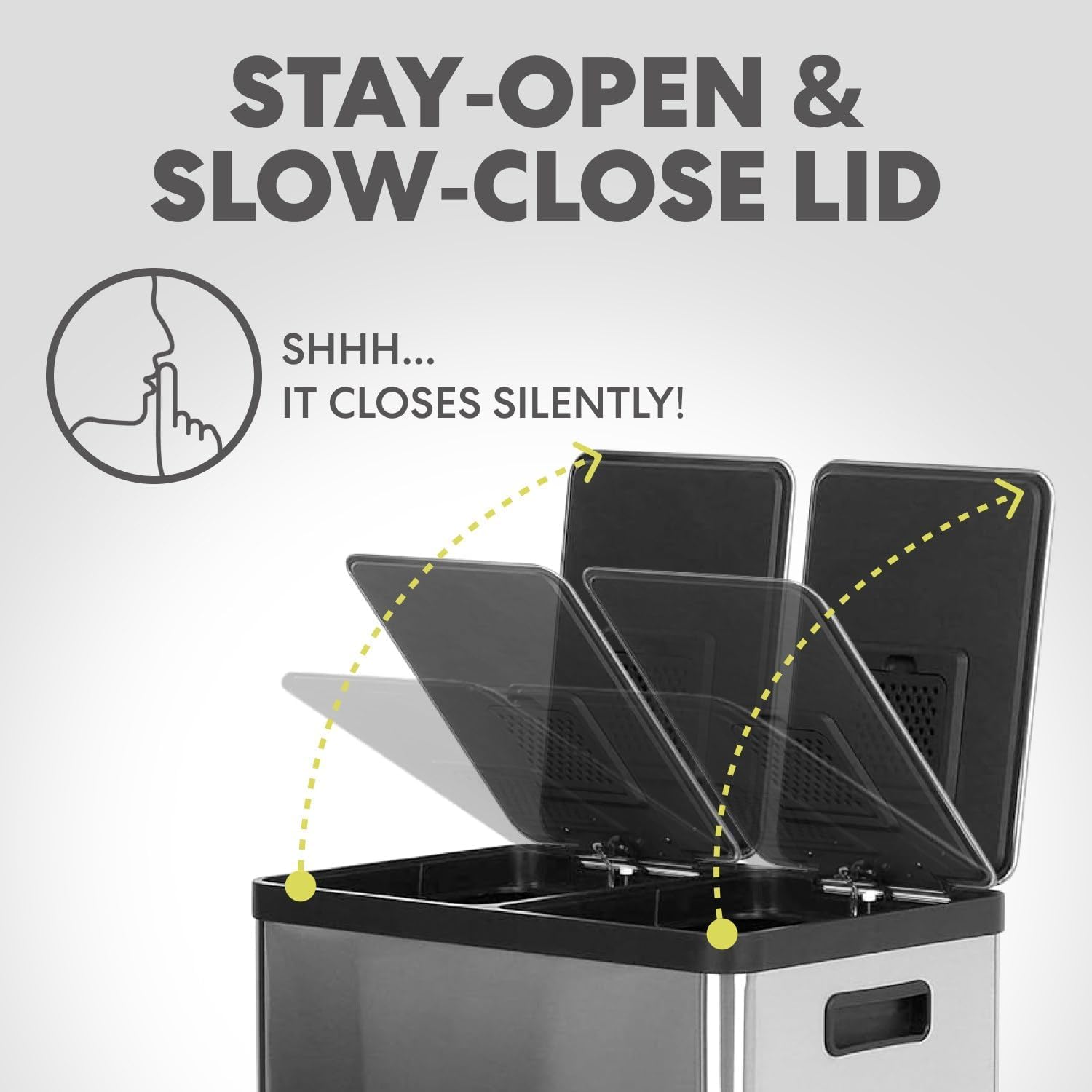 • SLOW CLOSE LID: Quiet, controlled lid closure is designed to reduce unwanted noise and ease down gently.LID LOCK: Extended open lid lock keeps the container open for longer tasks and chores.