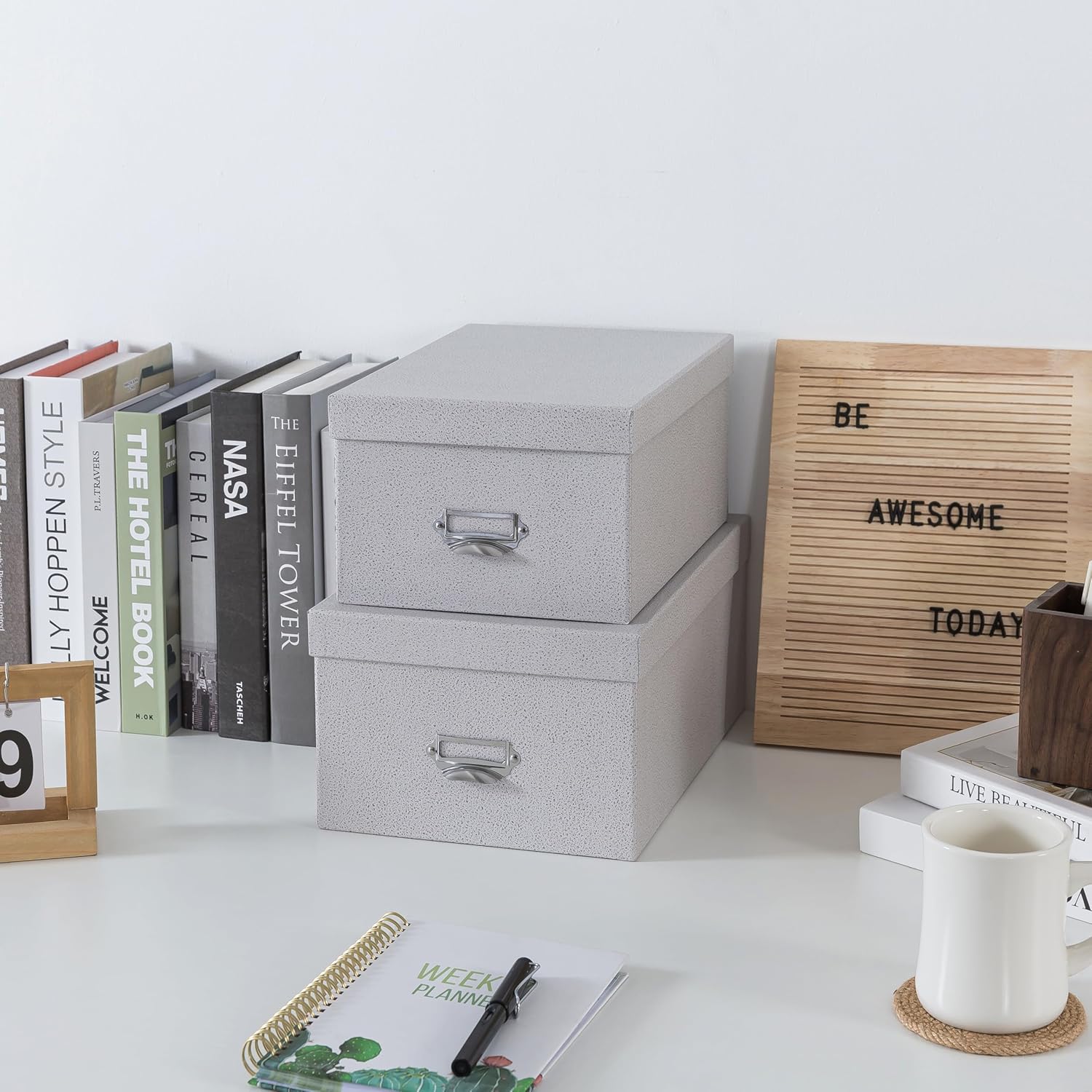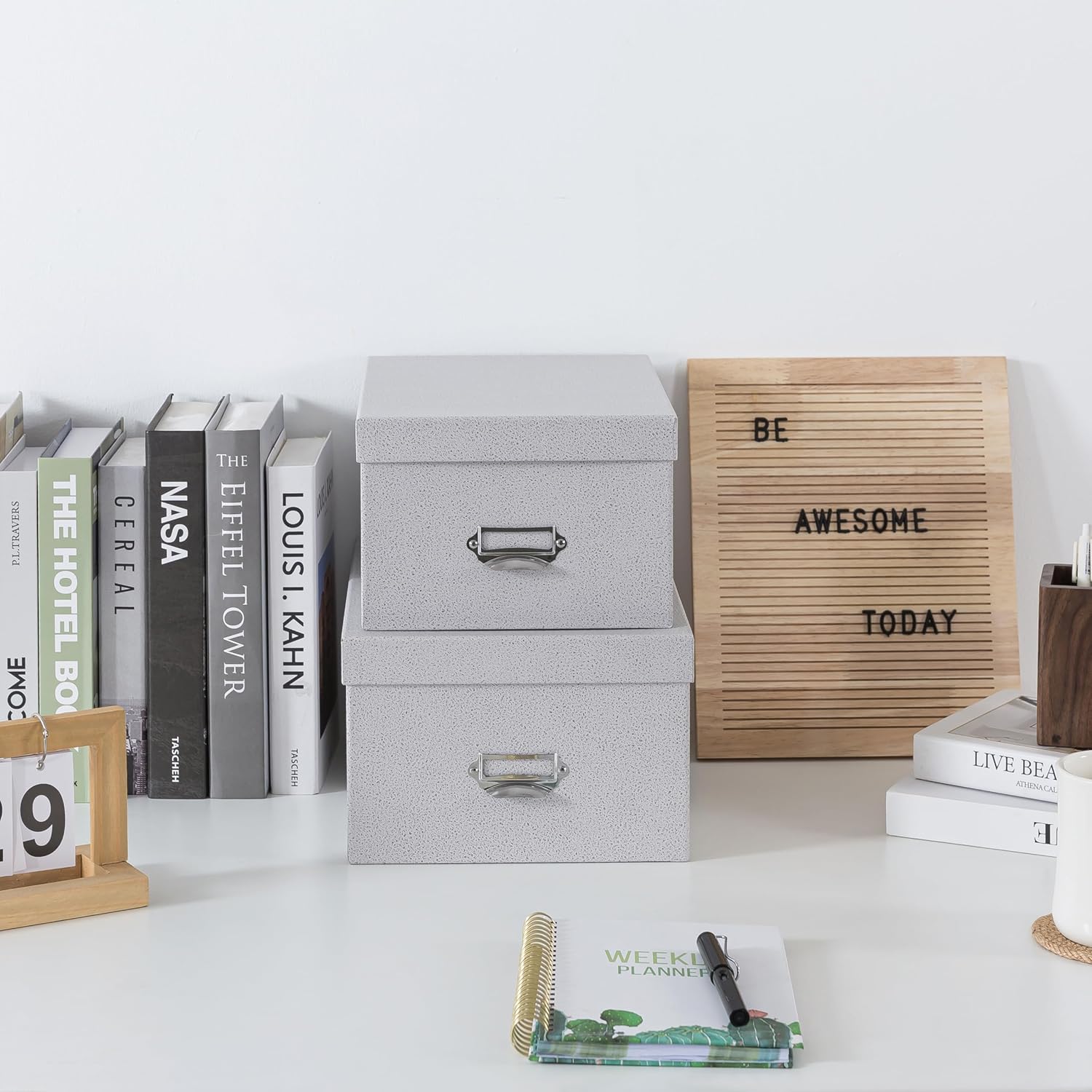 Soul & Lane Decorative Cardboard Storage Boxes with Lids, Set of 2 Stacking Keepsake Photo and Memory Boxes for Home & Office, Paperboard Organizers with Label Holders and Drawer Pulls, Cloud Gray