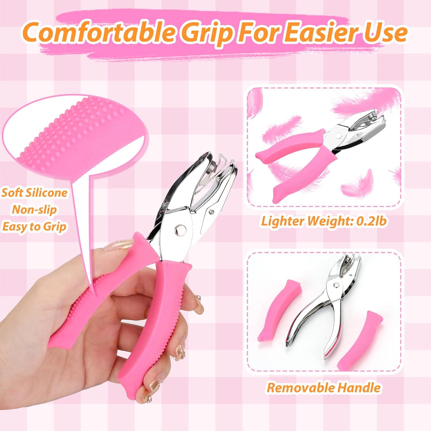 - 【COMFY GRIP, ZERO HAND STRAIN】 Say goodbye to sore palms! The cloud-soft silicone handles with anti-slip texture let you punch through 14 sheets of paper effortlessly. Feels like squeezing a stress ball – perfect for arthritis sufferers or little hands.