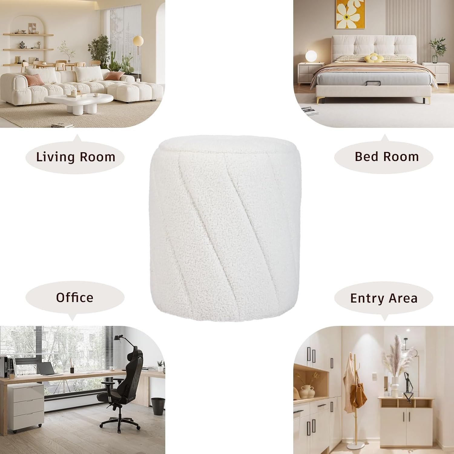 Modern Round Ottoman, Spiral-Tufted Foot Stool Ottoman, Teddy Fleece Upholstered Vanity Stool for Makeup, Bedroom, Living Room, White