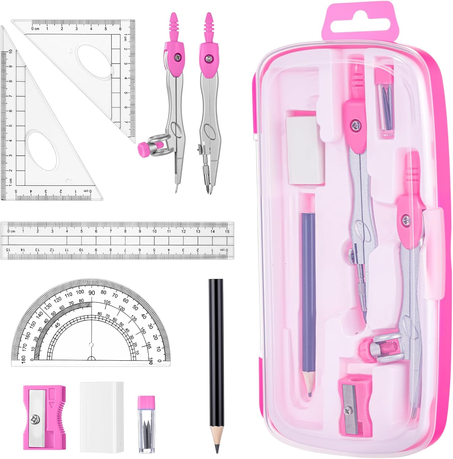 Zonon Math Geometry Set 10 Pcs Student Supplies with Shatterproof Storage Box, Includes Rulers Protractor Compass Pencil Sharpener Lead Refills Eraser Pencil for Drafting and Drawings(Pink)