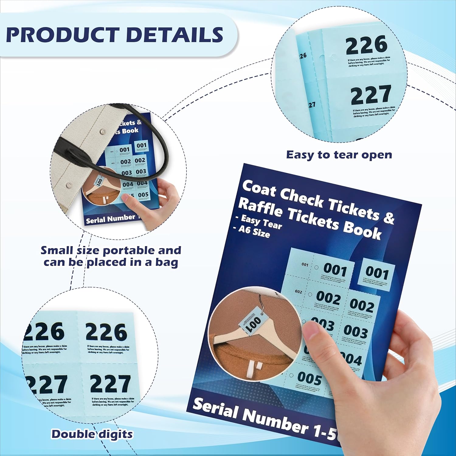 - Simple and Professional Look: All tickets come in a clean blue color, giving them a neat and professional appearance suitable for formal and casual settings alike. The uniform color helps maintain consistency and avoids confusion when sorting or distributing. Whether used in cloakrooms, raffles, or inventory control, the neutral design blends seamlessly into any environment and supports clear visibility of printed numbers.