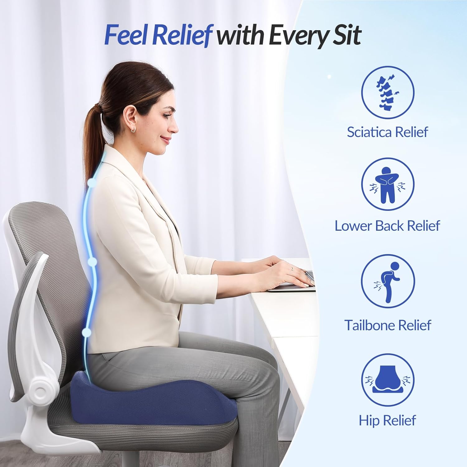 - 'W' and 'U' Shaped Designs for Effective, Targeted Relief: This office chair cushion is ergonomically shaped for sitting relief. The U-shaped cutout provides tailbone relief. The W-shaped front distributes thigh pressure and improves blood circulation, while straightening the posture. These designs make this chair cushion ideal for relieving pains in the sciatica, tailbone, lower back, legs, and hips during long sitting. Note: If you have any injuries, please consult your doctor before using