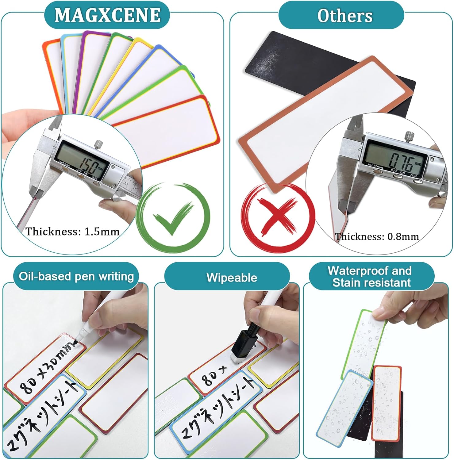 - 【Extra Thick Size】80 magnetic dry erase labels (10 per color, 8 colors) are 0.06 inches thick, more thicker and more resilient than other magnet label on the market. Dimensions: 8 x 3 cm (3.2" x 1.2") The 5 colors of magnetic labels are red, orange, purple, green, grass green, blue, sky blue and yellow. These colorful dry erase magnets labels are available in 8 stylish and adorable colors