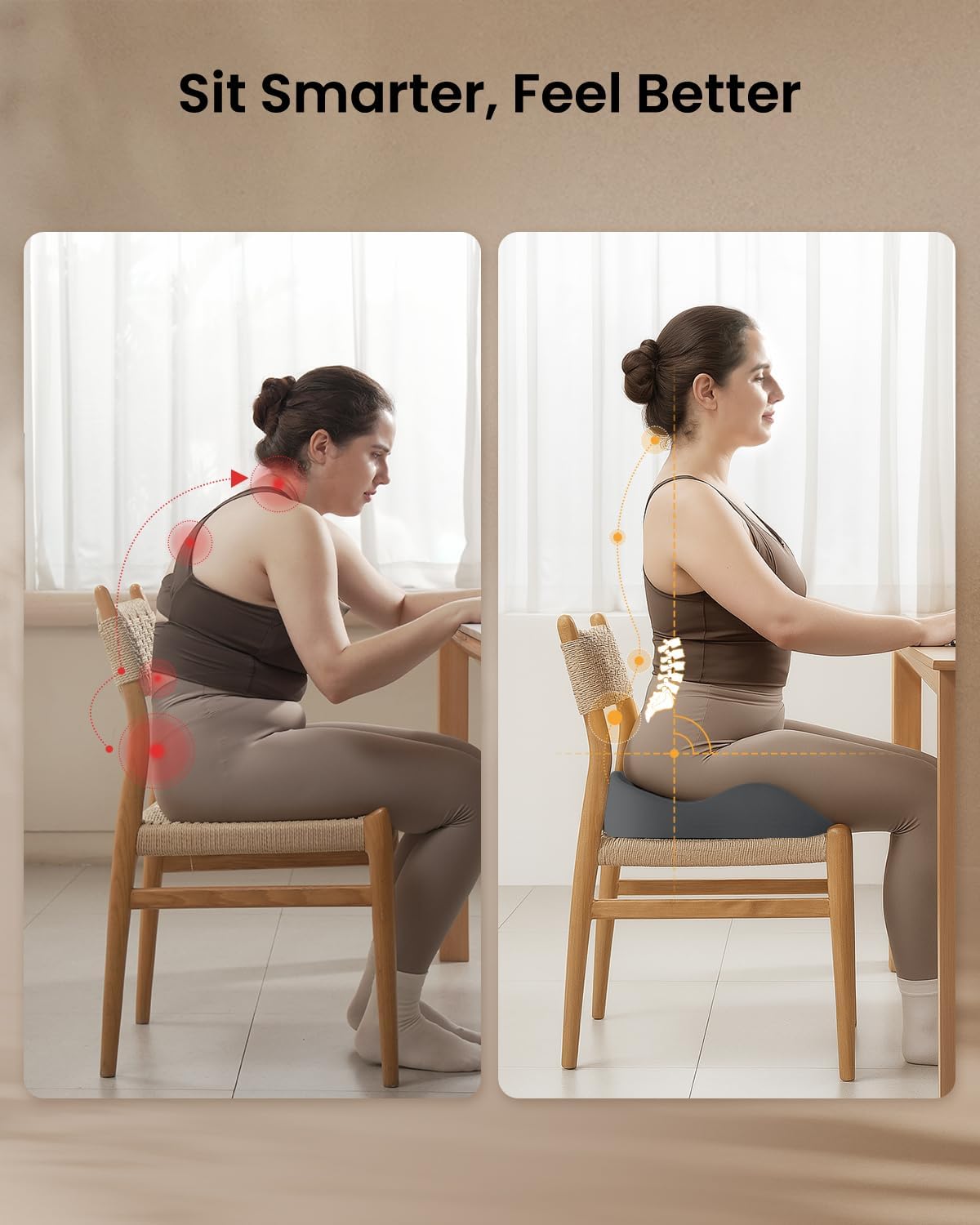- Targeted Pressure Relief: The split design of our cushion targets pressure points on hips, thighs, and coccyx, alleviating lower back and hip pressure while encouraging proper posture. Experience relief and comfort during extended periods of sitting