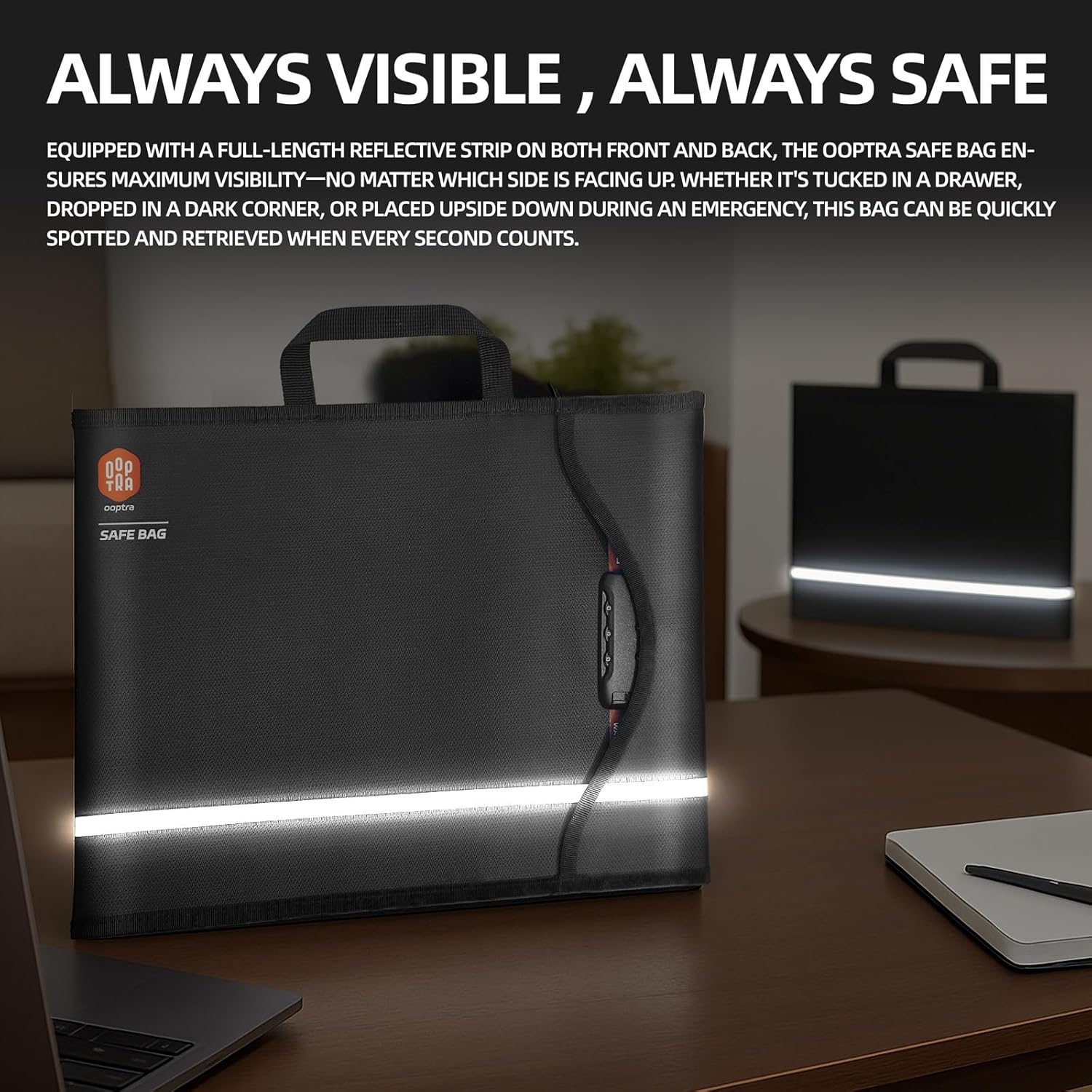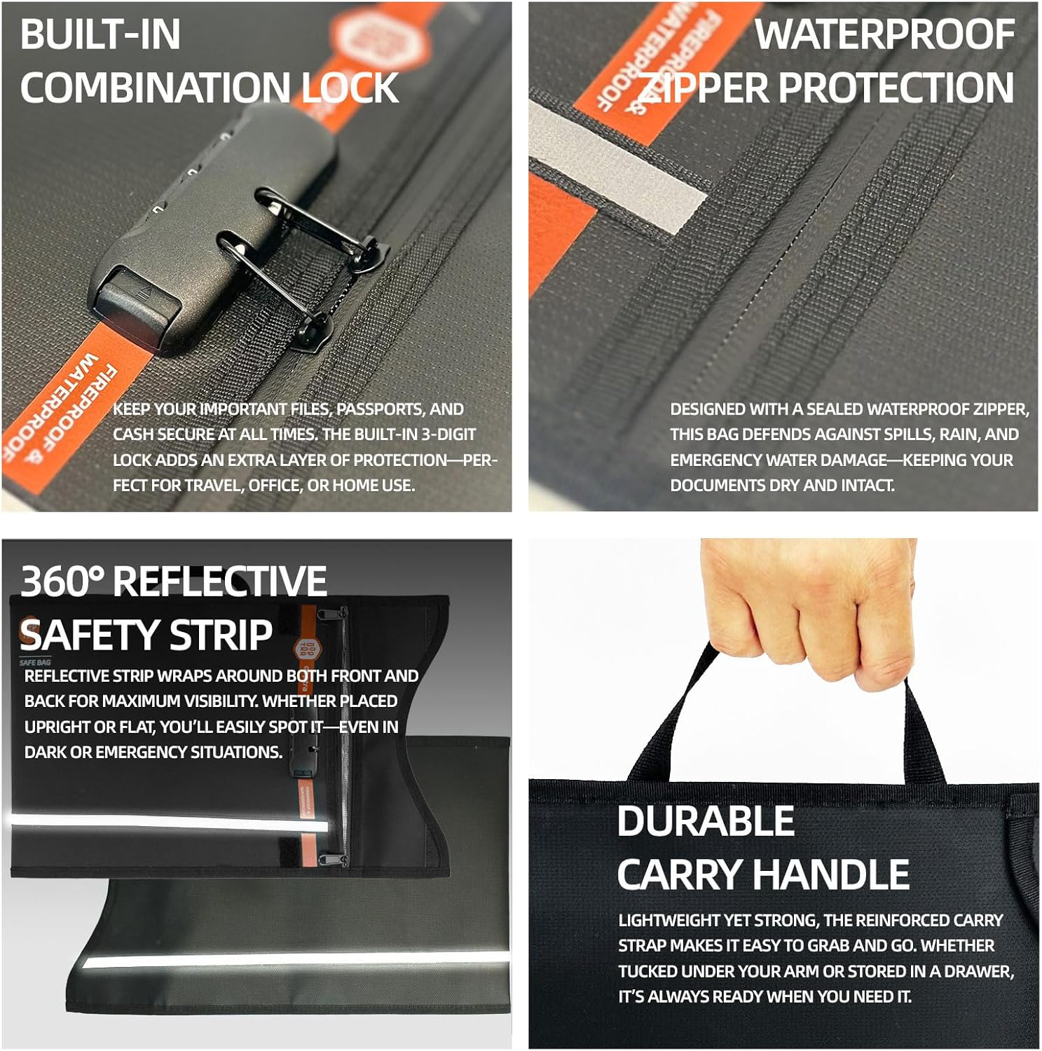 - 【Advanced 11-Layer Fireproof, Waterproof & Reflective Design】 Built with a new 11-layer fire-resistant structure and silicone-coated fiberglass, each bag offers enhanced protection—resisting heat up to 4200°F (short-term) while keeping out water, moisture, and smoke. The waterproof zipper further seals your valuables, and a full-length reflective strip ensures visibility in low light or emergencies.