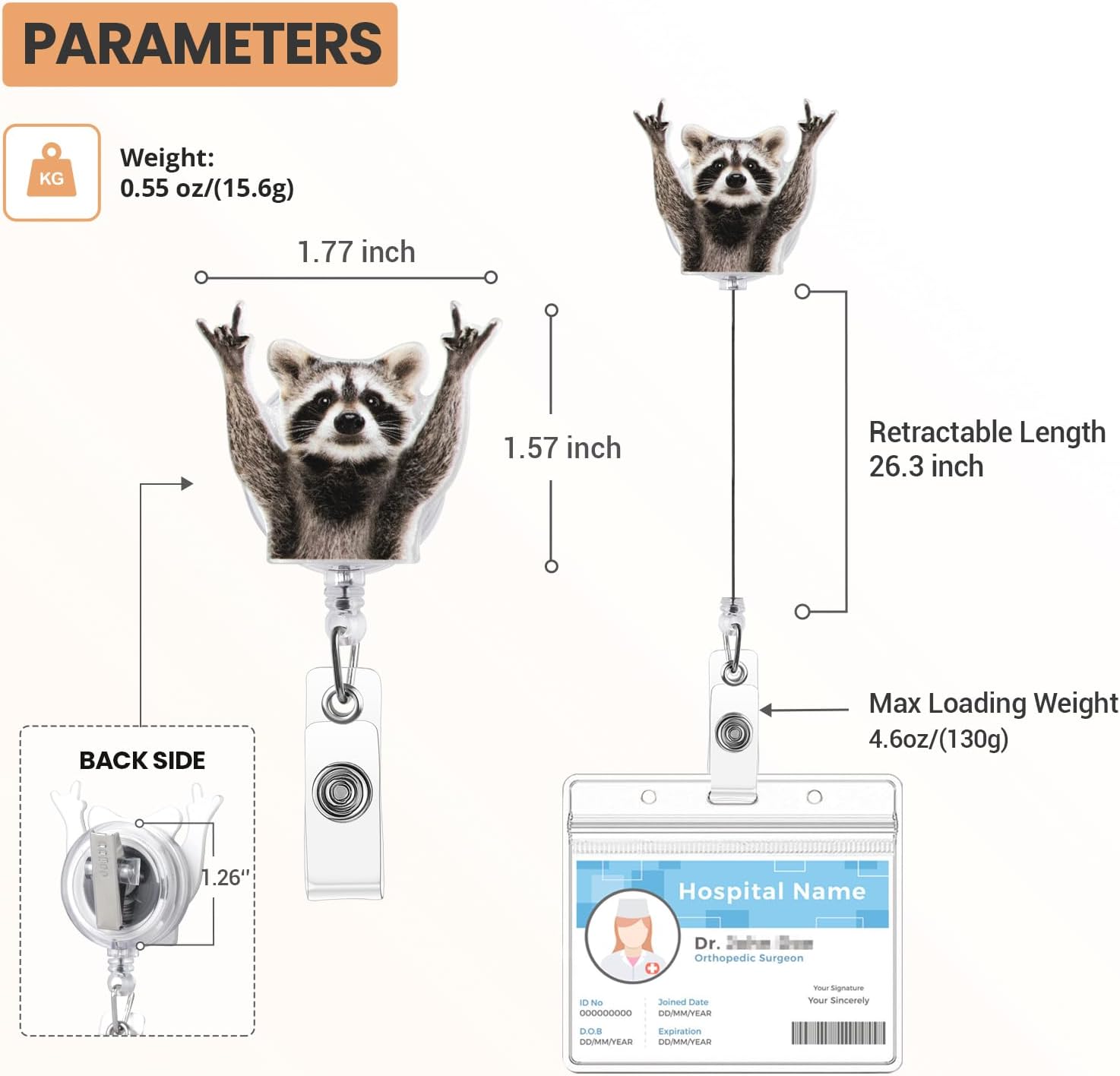 - Funny Raccoon DESIGN: This cute badge reel features an adorable raccoon design that adds cuteness and fun to your uniform. A perfect retractable badge holder cute accessory that will bring you joy every time you clip it to your work uniform.