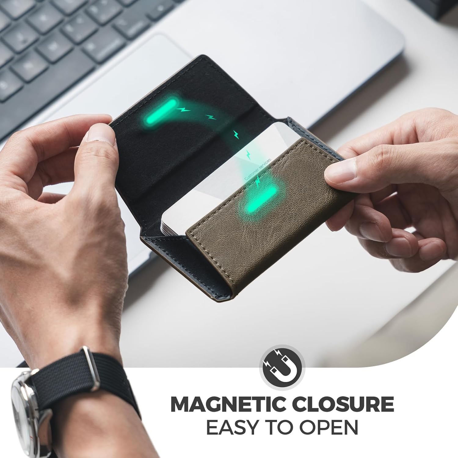 VULKIT Leather Business Card Holder Case for Men Slim Pocket Business Card Wallet Name Card Case Holder, Holds 20 Business Cards Olive