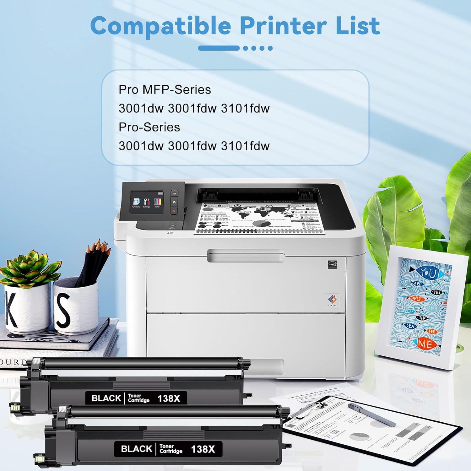 138X W1380X Toner Cartridge 2 Black with Chip Compatible for HP 138X Work with Laser Jet Pro 3001dw 3001fdw 3001, MFP 3101fdw 3101 High Yeild Printer Toner Cartridge 4,000 Pages
