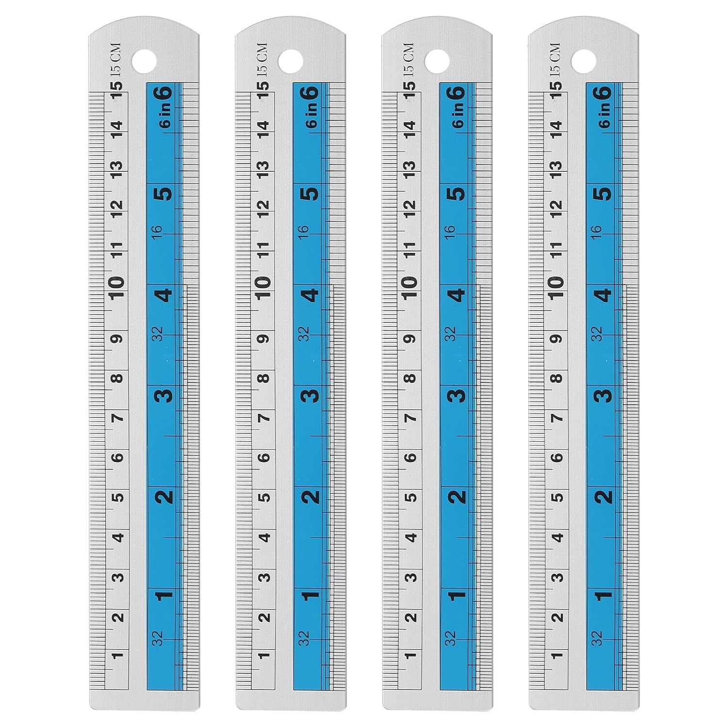 HARFINGTON 4pcs Metal Straight Ruler 15cm Metric SAE Aluminum Alloy Measuring Rulers Scale Tools with Hole for Measure Study Reading Classroom Office, Blue