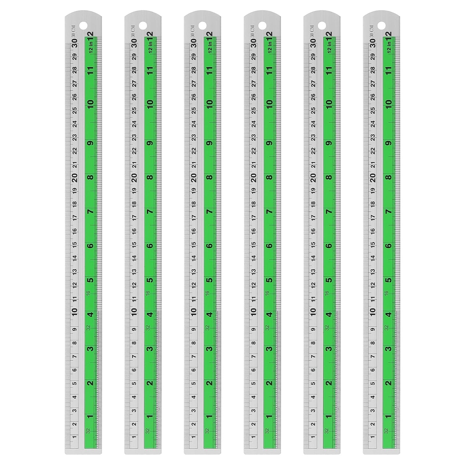 HARFINGTON 6pcs Metal Straight Ruler 30cm Metric SAE Aluminum Alloy Measuring Rulers Scale Tool with Hole for Measure Study Reading Classroom Office, Green