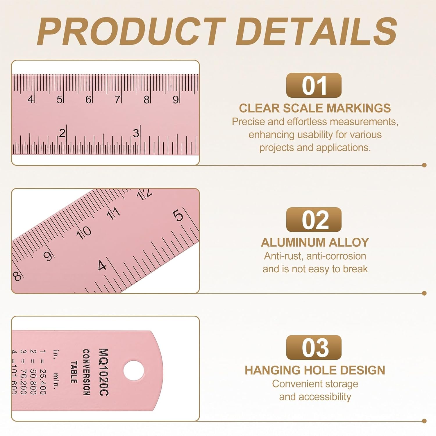- Feature - The ruler features ink printing technology on its surface, ensuring that the scale is clear and sharp, remaining non-fading and non-blurring even after long-term use. It has a dual-scale design, and the back is carefully printed with a complete set of conversion formula for metric and SAE units, allowing beginners to quickly master unit conversion skills. Additionally, it includes a hanging hole design for convenient storage and accessibility.