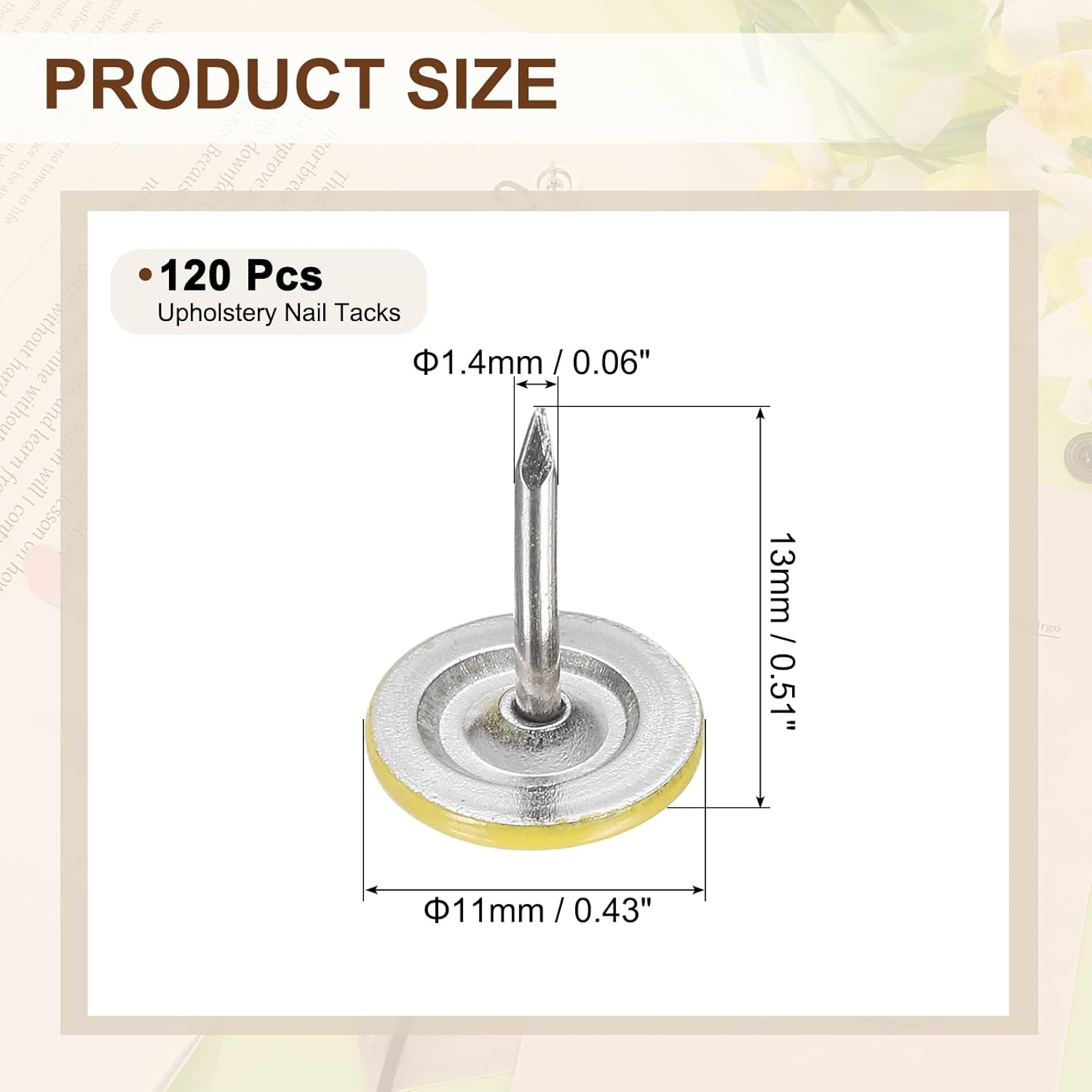 - [Size & Quantity] - The package comes with 120pcs decorative upholstery tacks. Sufficient quantity to meet your different daily needs. The overall size of upholstery nails is about 11mm x 17mm/0.43-inch x 0.67-inch(D*H)