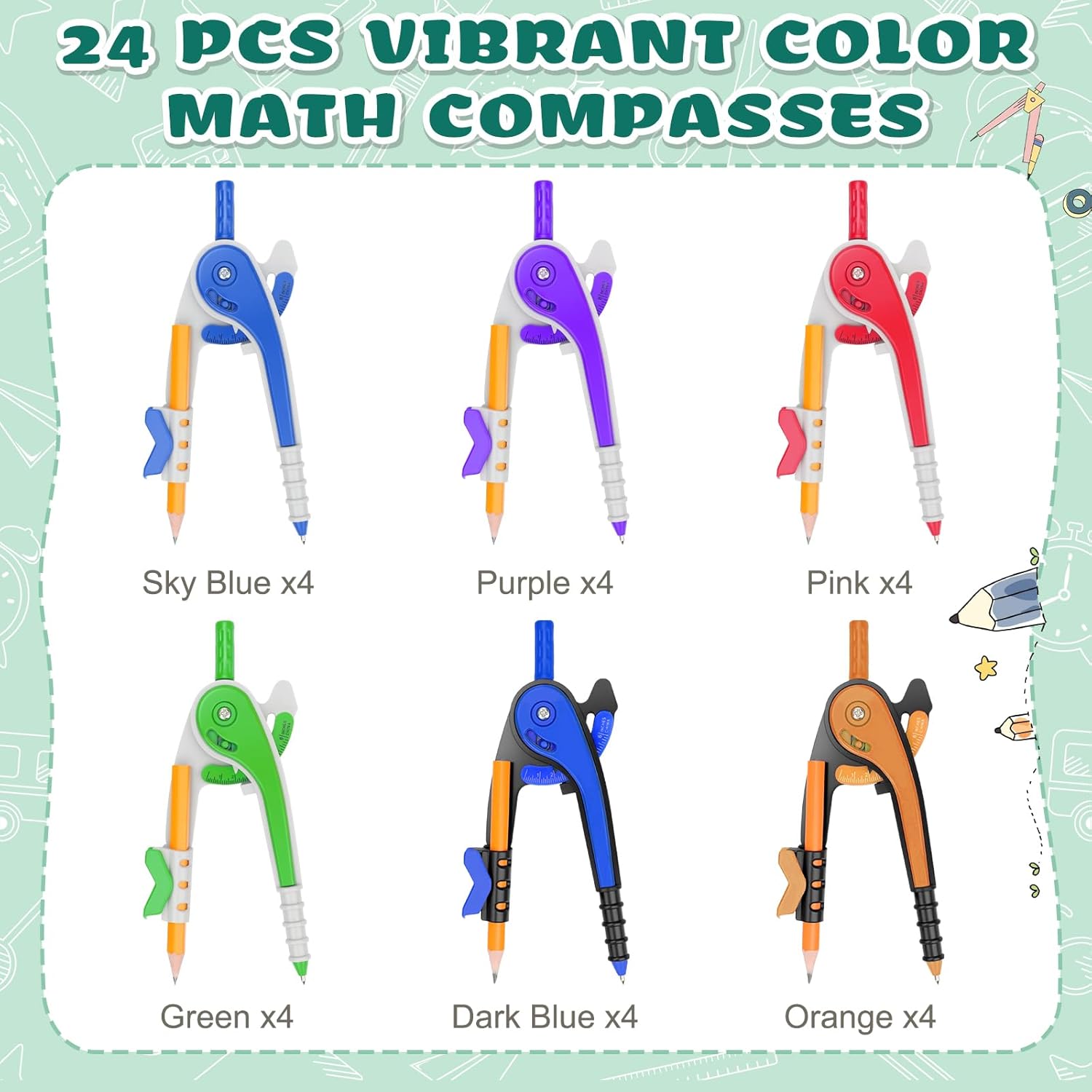 - Vibrant Colors: The geometry compass set includes 24 pieces math compasses in different colors--pink, sky blue, green, purple, blue, and orange(4 of each color),and 24 pieces clear plastic protractors and 24 pieces plastic rulers. Each math compass comes with a detachable drawing pencil. The ample quantity and bright colors make this set ideal for subject districts and teachers who need to provide multiple compasses for all