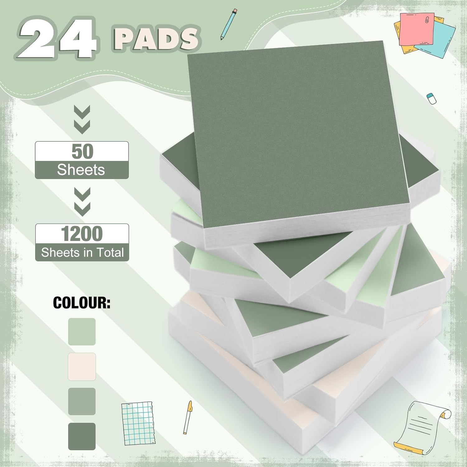 - Package Includes: you will receive 24 packs of sticky notes in 4 colors, 6 packs each color, 50 pieces for each pack, 1200 sheet in total, the size of each self sticky note is about 2 x 2 inches; Sufficient quantity can meet your daily use and replacements, and you can share them with your friends and colleagues