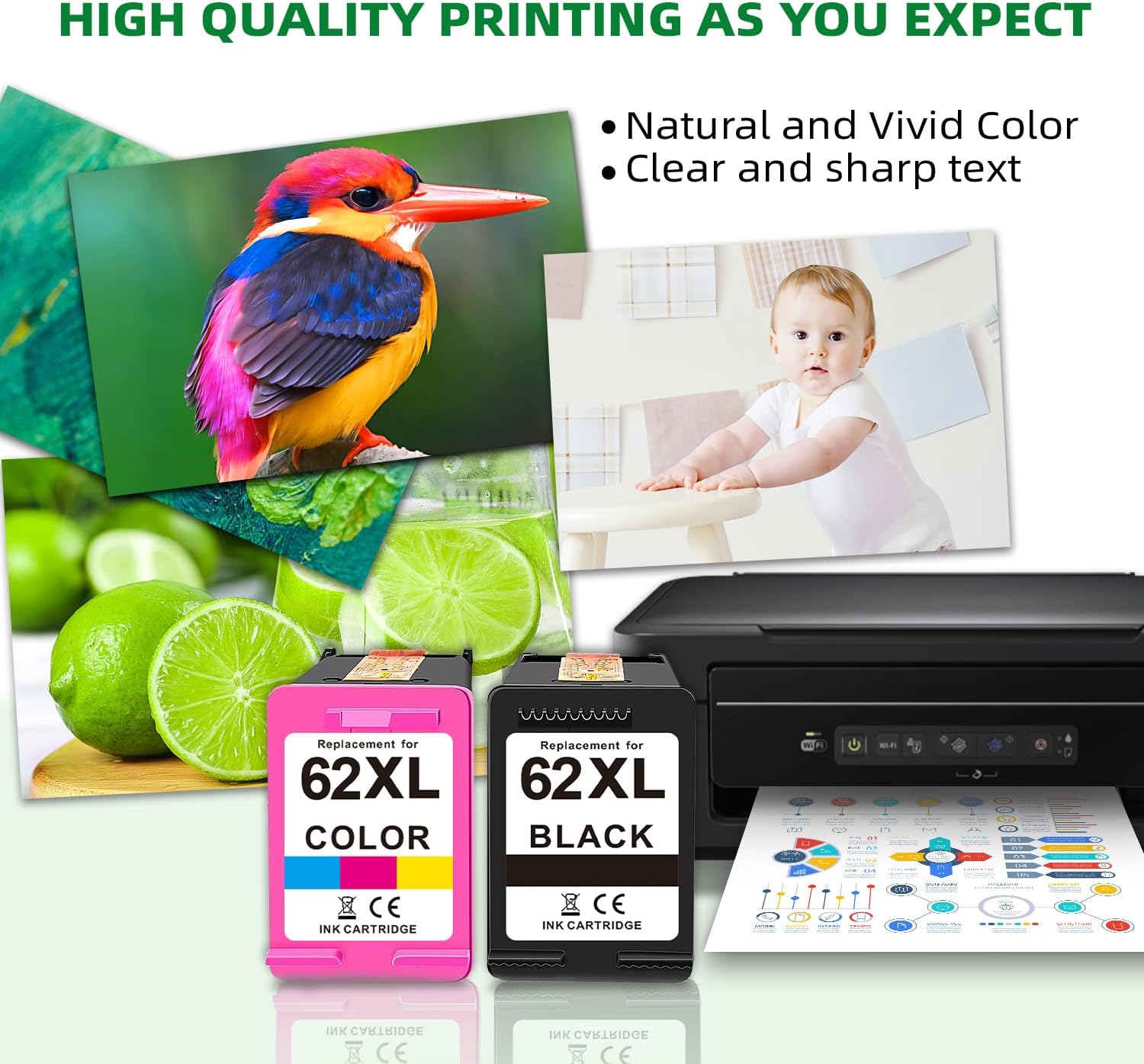 - Eco-Friendly & Cost-Effective: Recyclable packaging and non-toxic ink reduce environmental impact. Compared to standard cartridges, the 62XL high-yield design lowers waste and offers a 40% longer lifespan, making it a budget-friendly choice for households and offices