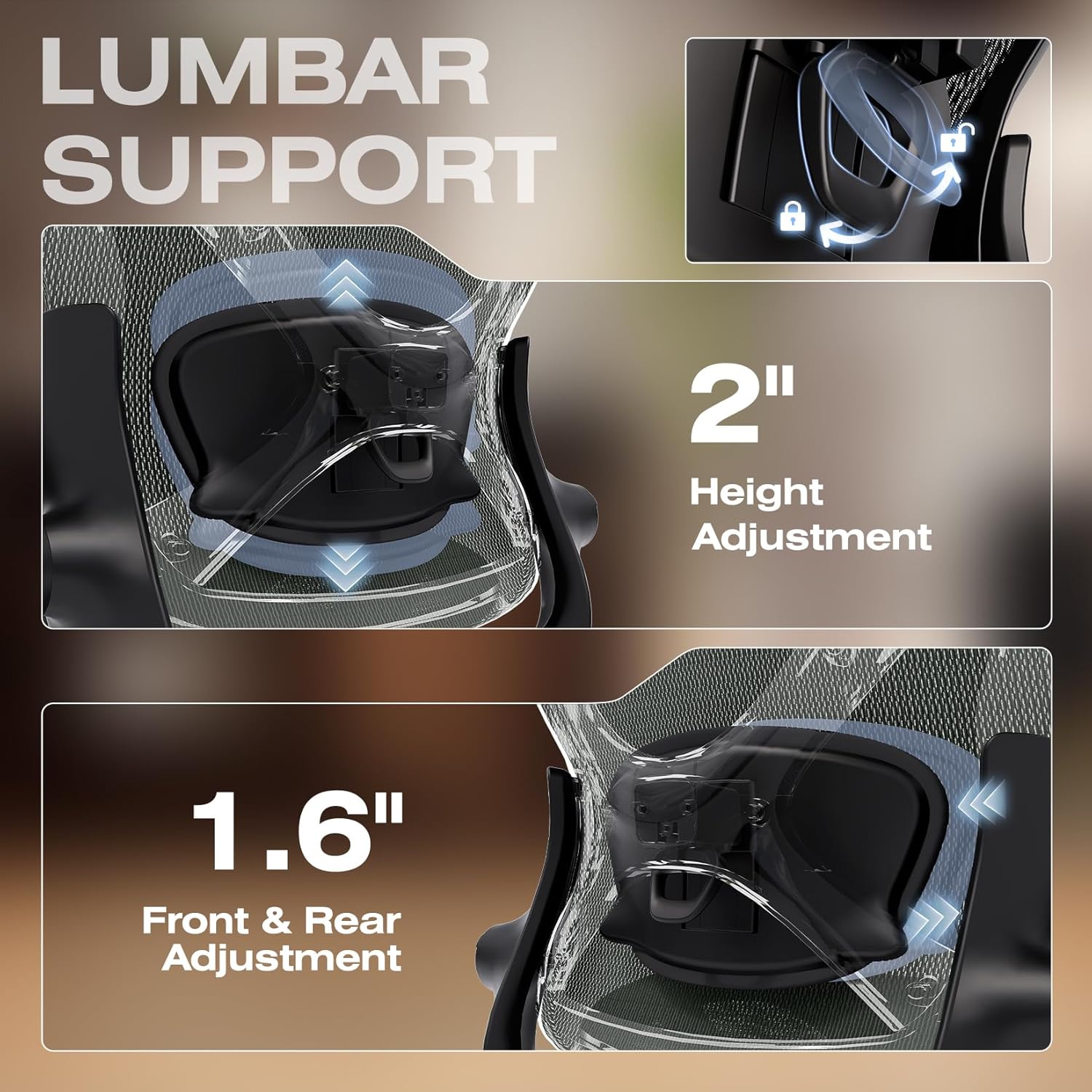 - 【Engineered with Dynamic Spinal Alignment System】3D Synchro-Tilt Lumbar(Lockable ±1.6" depth spring-loaded auto-tracking/±2" height/15° rotation)with force-sensitive springs mimics natural spine curvature, certified by AEP* for 12hrs+ fatigue reduction in ergonomic chairs (*American Ergonomics Partnership)