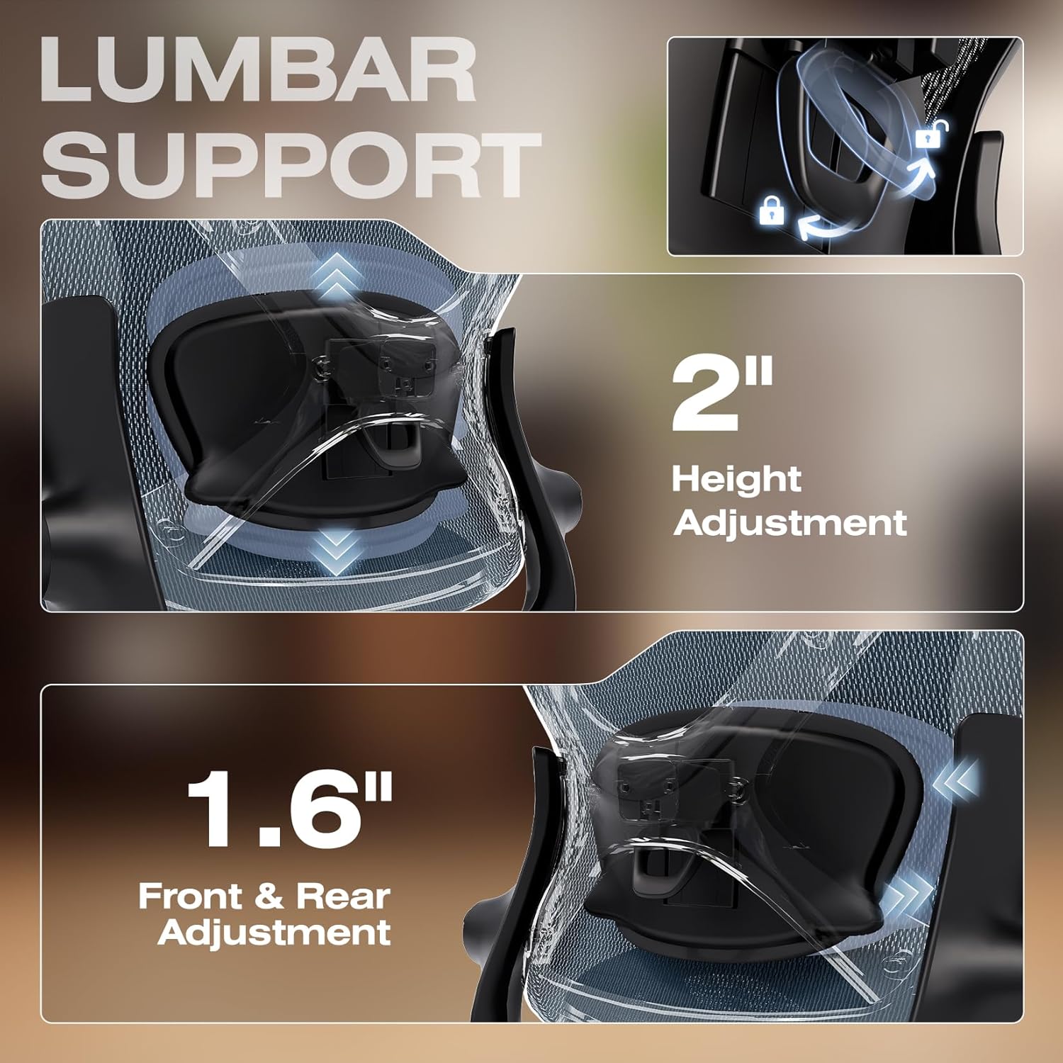 - 【Engineered with Dynamic Spinal Alignment System】3D Synchro-Tilt Lumbar(Lockable ±1.6" depth spring-loaded auto-tracking/±2" height/15° rotation)with force-sensitive springs mimics natural spine curvature, certified by AEP* for 12hrs+ fatigue reduction in ergonomic chairs (*American Ergonomics Partnership)