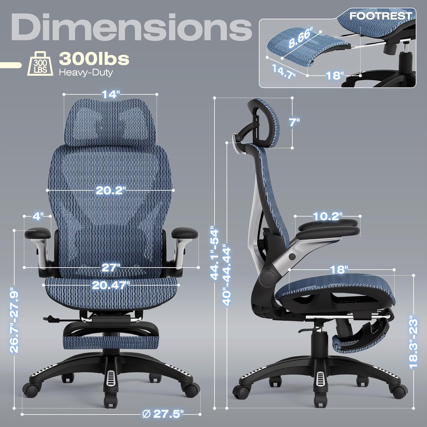 ELABEST X100 Ergonomic Office Chair with Footrest, Big and Tall Home Desk Chair with 5D Flip-Up Arms, Adjustable 8D Lumbar Support,High Back Rolling Computer Chair, Swivel Mesh Chairs (Oaxaca Blue)