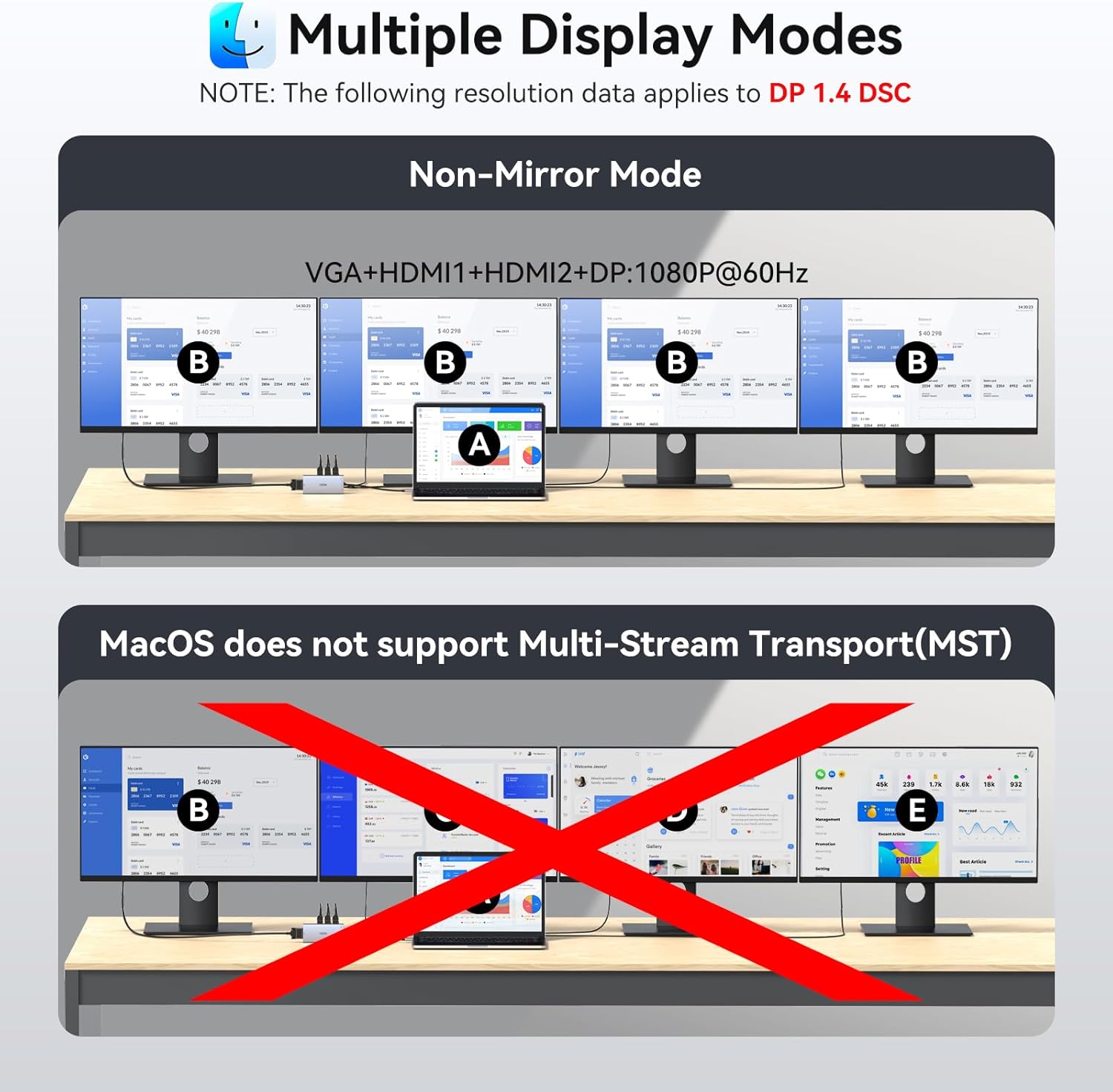 - Laptop Docking Station 4K Display Adapter: The Docking Station for dell laptop with 4 video output ports: 2 HDMI+DP+VGA, can output up to 4K Dual/Triple Display videos; For quadruple display Dual HDMI, DP, and VGA all are 1080@60Hz. Please make sure your laptop specification support DP1.4 signal output. If the VGA port is connected, it will affect the resolution of all displays up to 1080P only