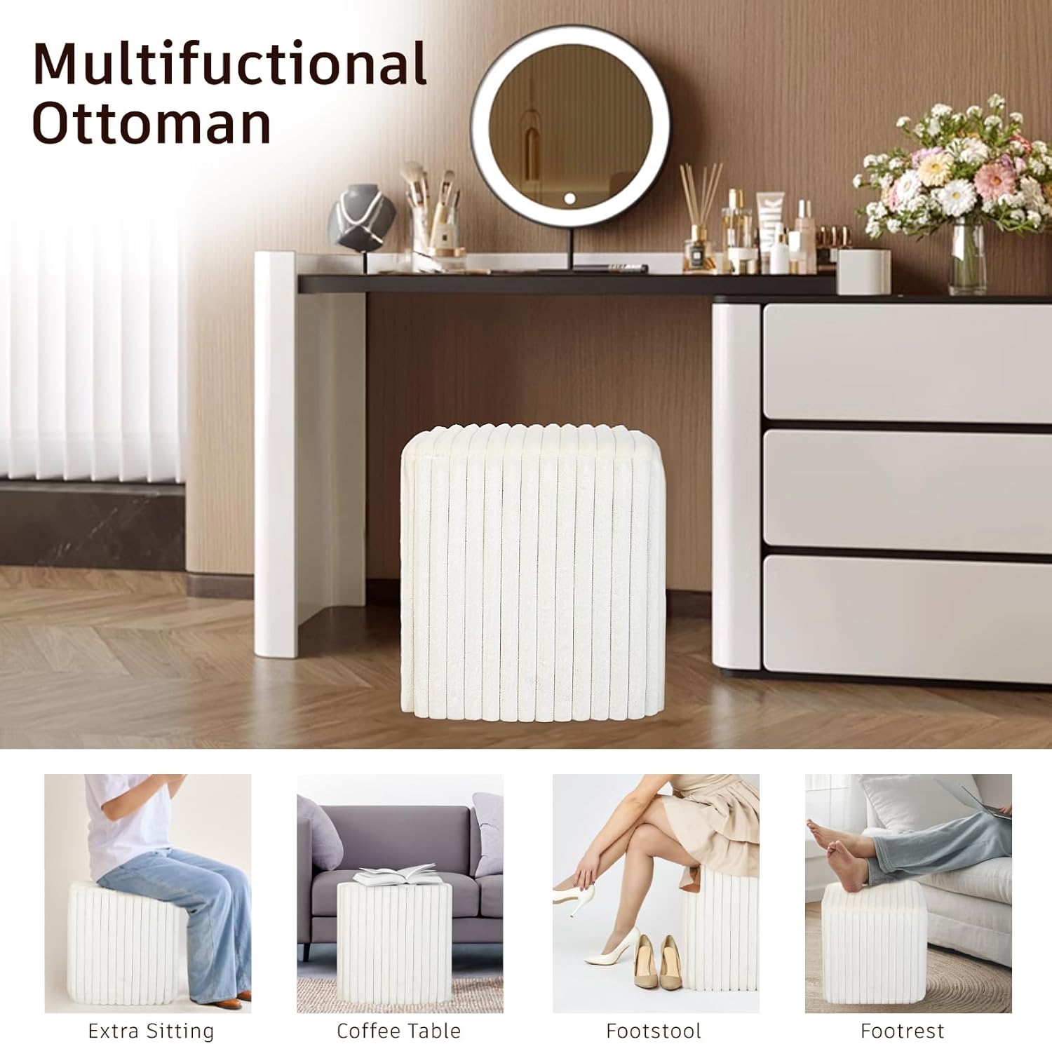 - Widely Use- This pouf ottoman can be placed anywhere as well, including in front of a sofa, against a wall, or in a corner. These work well in a playroom, rec room, or living room. modern ottoman look stylish and are easily accessible at the foot of a bed in a bedroom or guest room. You can use a vanity ottoman as vanity seating in a bathroom or walk-in closet.