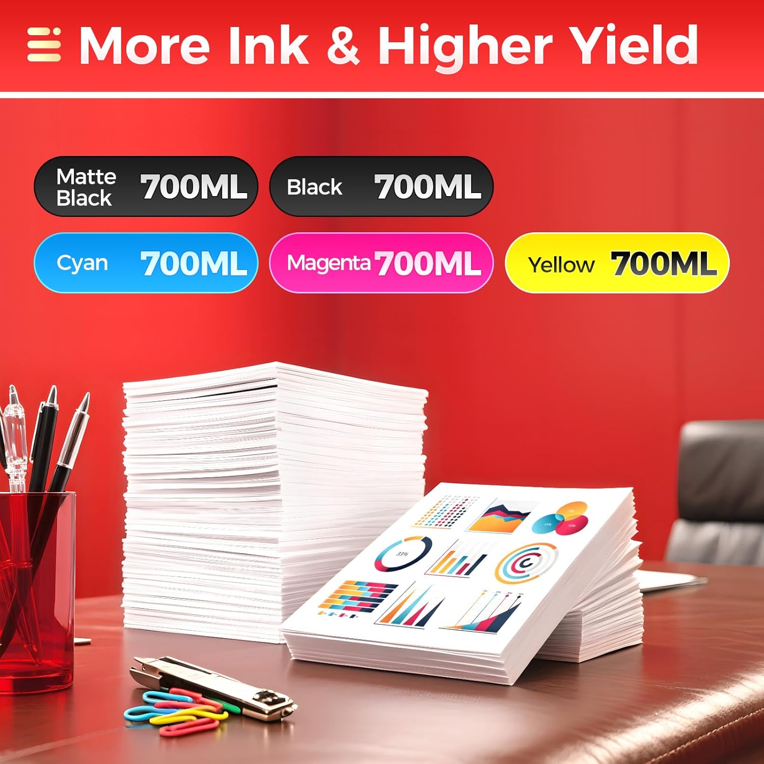 - Ink Volume: The capacity is 700ML per ink cartridges, Total ink volume is 3500ml.