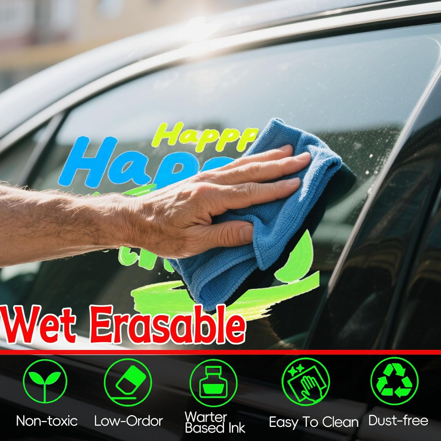 - 7MM Car Window Markers: Whether you want to send a special message or customize your car, 8 Colors liquid chalk markers will get the job done well. Each marker features a 7mm 2-in-1 large nib and vibrant neon colors. 2 in one Nib - The Rectangular Tip enables you to use the Markers as 2 Tips - Wide Lines, bold lines & thin fine lines, making these chalk markers versatile for all your painting needs.