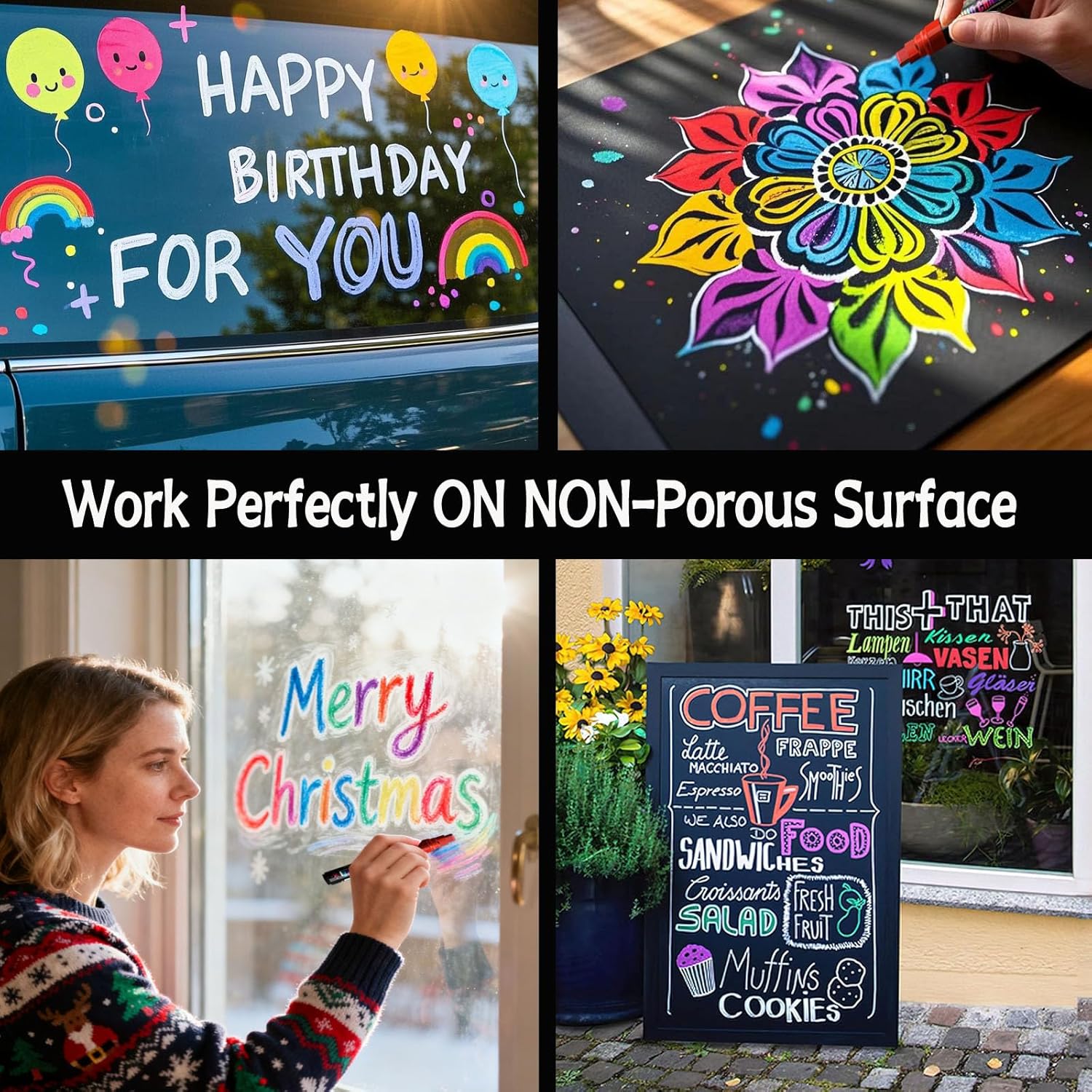 - Versatility: Use chalk markers to make your writing or drawing stand out. These vibrant chalkboard markers make bright marks on chalkboards, light boards, whiteboards, windows, glass, and more. These large chalk marks demonstrate their versatility on any non-porous surface. Rely on these markers for eye-catching presentations or writing in classrooms, businesses, or homes. Ideal for car decorations, whiteboards, blackboards, pub boards, Christmas banners, posters, and various DIY crafts.