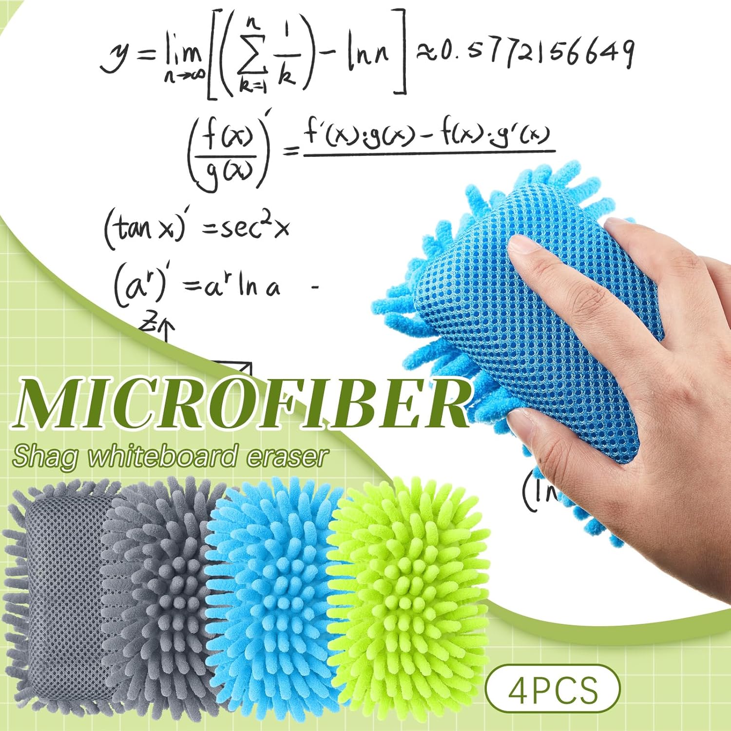 - What You Will Get: comes in 4 pieces microfiber shag dry erase board erasers, 1 blue, 1 green, 2 gray; Dual surface design brings a different touch to whiteboard erasers, adds a creative spin to your office conference room or classroom; Enough quantity for your daily use and replacement