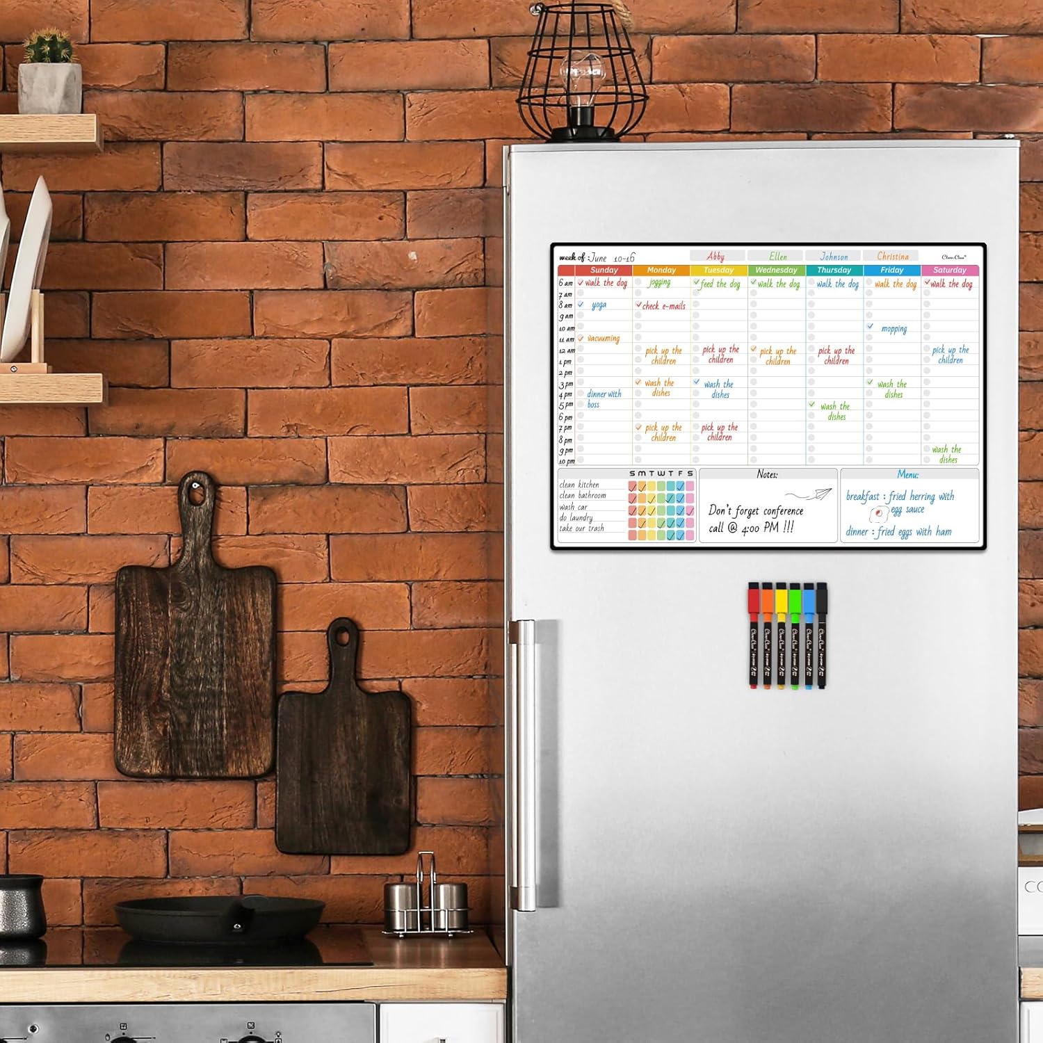 Magnetic Dry Erase Weekly Calendar for Fridge - Large 17"x12" Magnetic Weekly Planning Board with Hourly Time Slots - 6 Extra Fine Point Markers Included