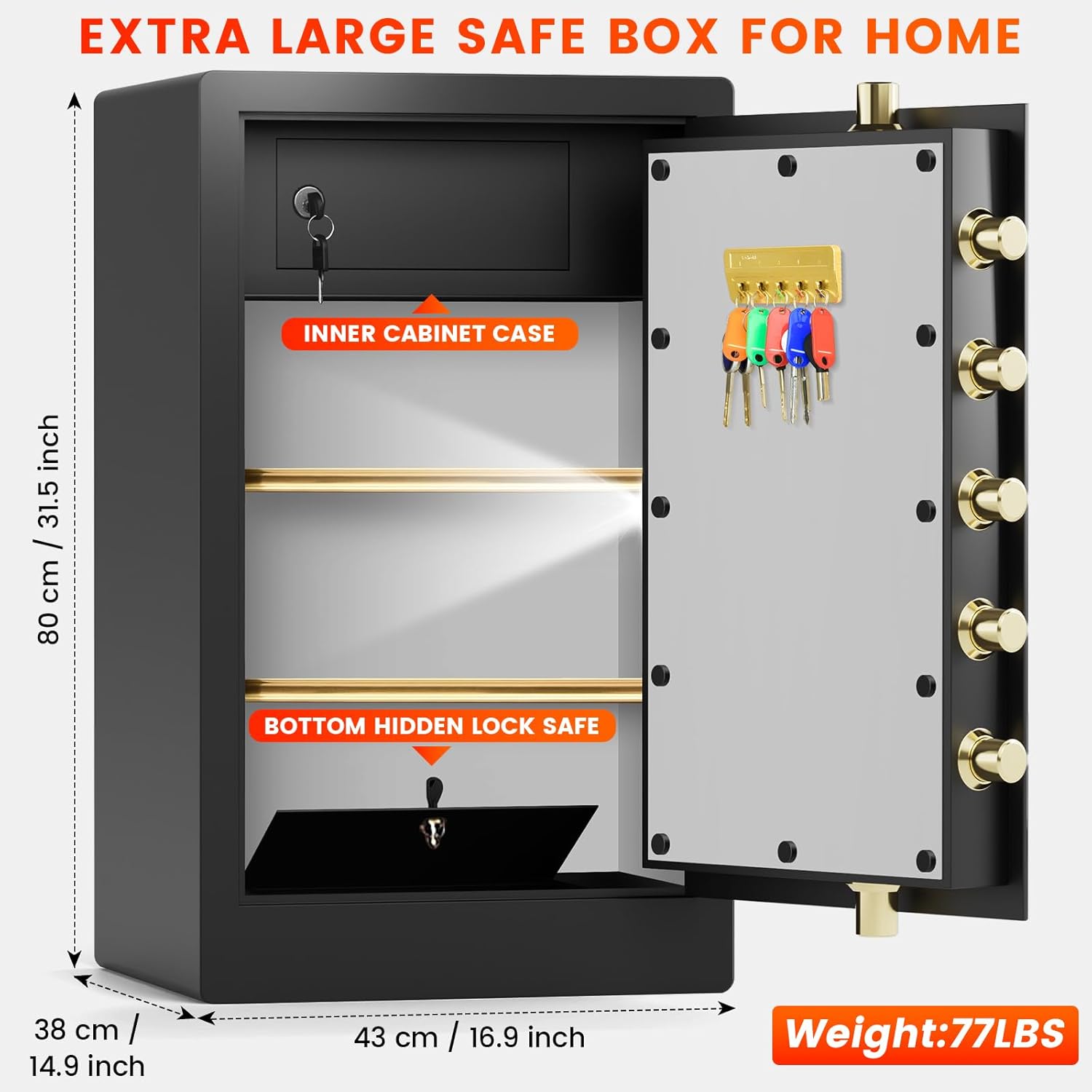 - EXTRA LARGE SAFE BOX FOR HOME: Our fireproof safe has a extra large size. The external size is 14.9"D x 16.9"W x 31.5"H, weights 77 pounds. Supper large inner space allows you to load almost all of your valuables like laptop, pistol, jewelry, documents, cash etc. The interior is lined with soft felt to protect your valuables from wear. Inner lock box can further protect your valuables