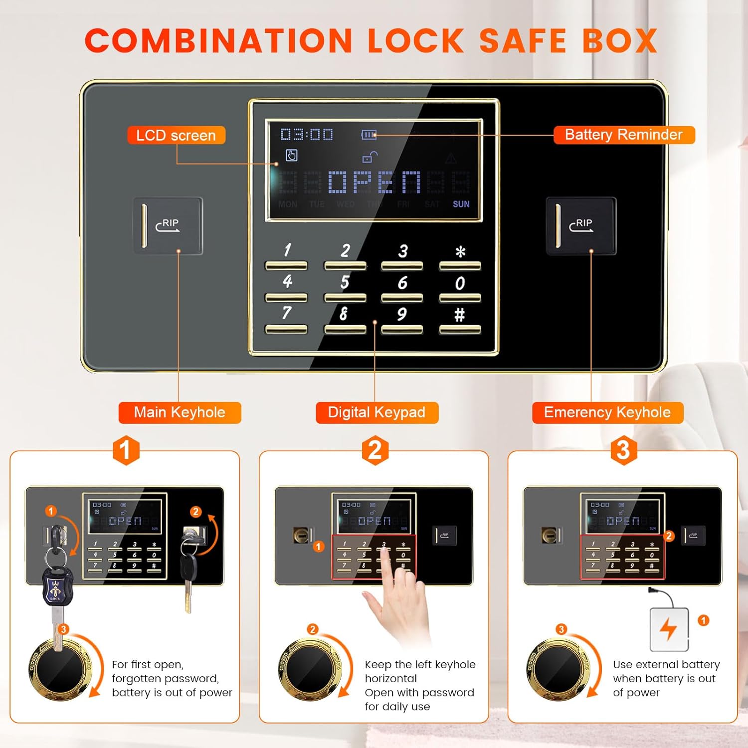 - 2 UNLOCKING WAYS: Our home security safe is designed with responsive digital keypad and spare keys. β Use the emergency key to open the safe when your forget the password. β‘ Open the safe with password in your daily use and donβt have to worry about hiding & keeping track of a key. External battery case to prevent emergencies when the battery is dead and the key is not present