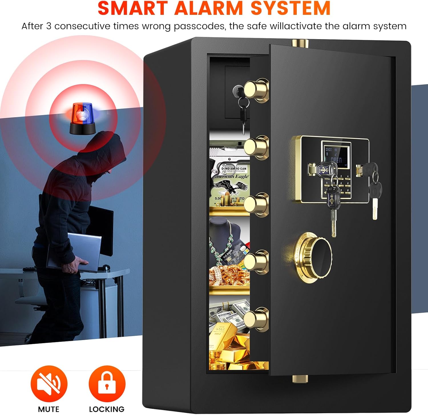 - DUAL SECURITY ALARM: Our safe comes with a dual alarm system to prevent password guessing. if you enter the wrong password 3 times in a row, the safe will emit a continuous warning sound, which can effectively deter unauthorized access and secures valuables away from kids. Input correct can relieve alarm