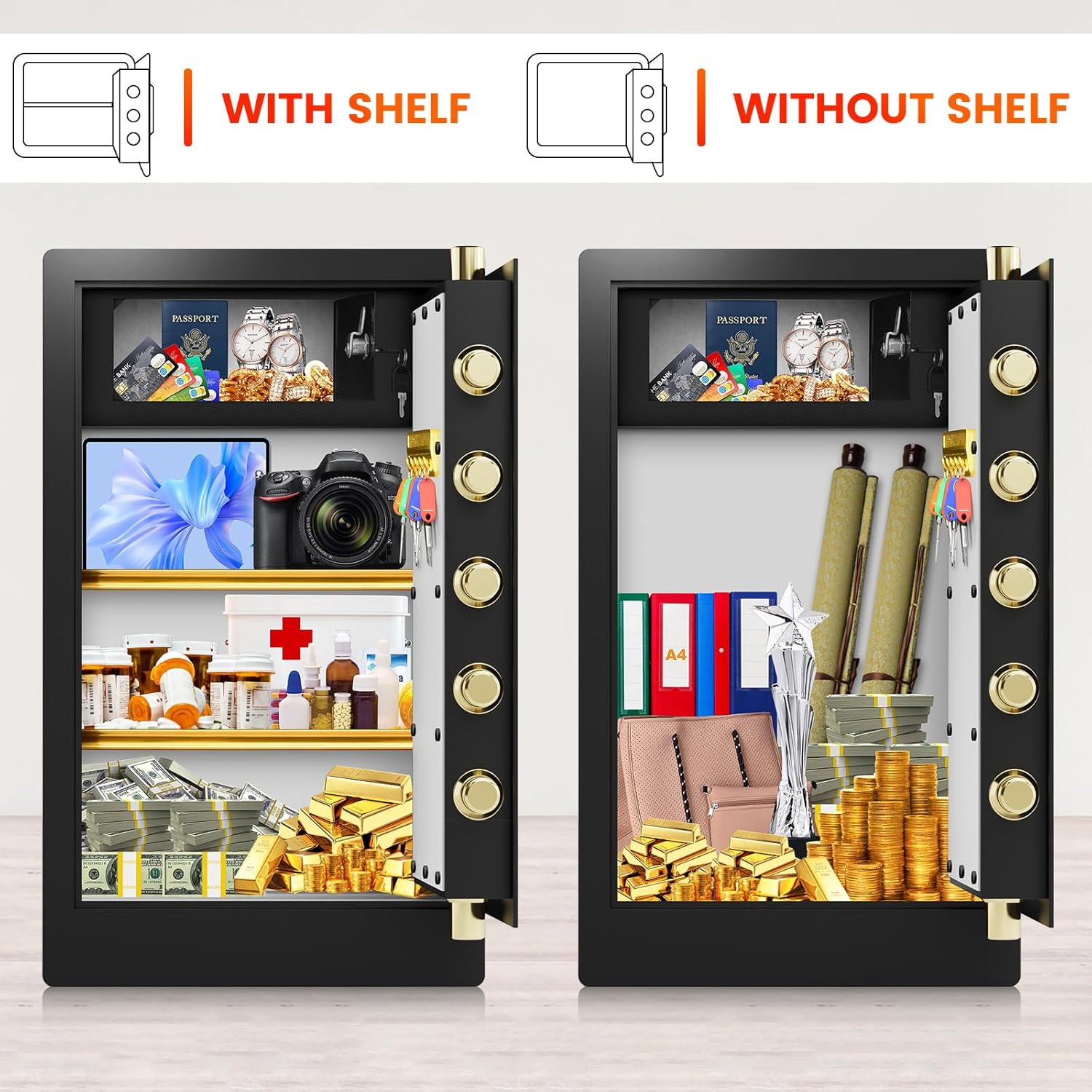 - HEAVY DUTY & HOME SECURITY: This large safe box is made of solid steel construction with coating. 7*30mm high-strength live steel lock bolts and 65mm ultra-thick alloy pry-resistant concealed hinges & recessed door provide physical protection against forced entry. Weighing 77 pounds, the safe is difficult to move. Keep burglars and angry teen from getting your possessions and protecting your privacy