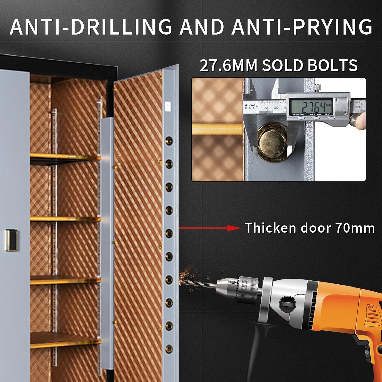 - 【SECURITY AND ANTI-THEFT SYSTEM】:This safe features a motion-sensitive alarm that locks the panel for 180 seconds after 5 incorrect fingerprint or 3 password attempts. After unlocking, just 1 wrong entry will re-trigger the alarm. With a deep drop slot, solid steel body, 14 live-locking bolts, and double impact hinges, it offers strong protection against tampering and forced entry.
