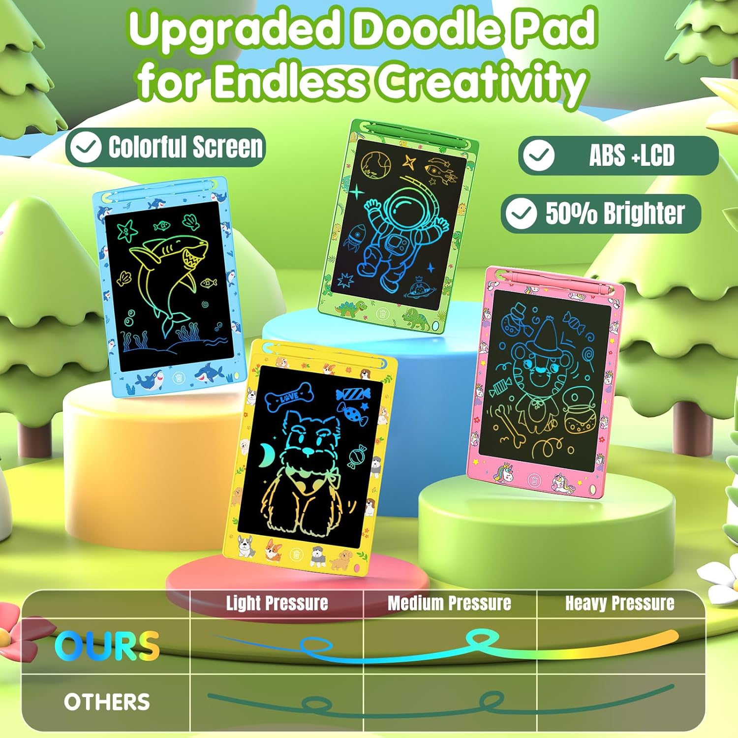 - 4 Pack for Share: Our product features four unique themes - unicorn, dog, shark, and dinosaur. This allows multiple kids to play together or provides ample opportunities for a single child to explore different themes. These tablets go basic beyond writing tools. As children draw, they can embark on creative journeys through various imaginative worlds. Equipped with pressure - sensitive technology, children can create lines with varying thicknesses, adding more fun to the creative process.