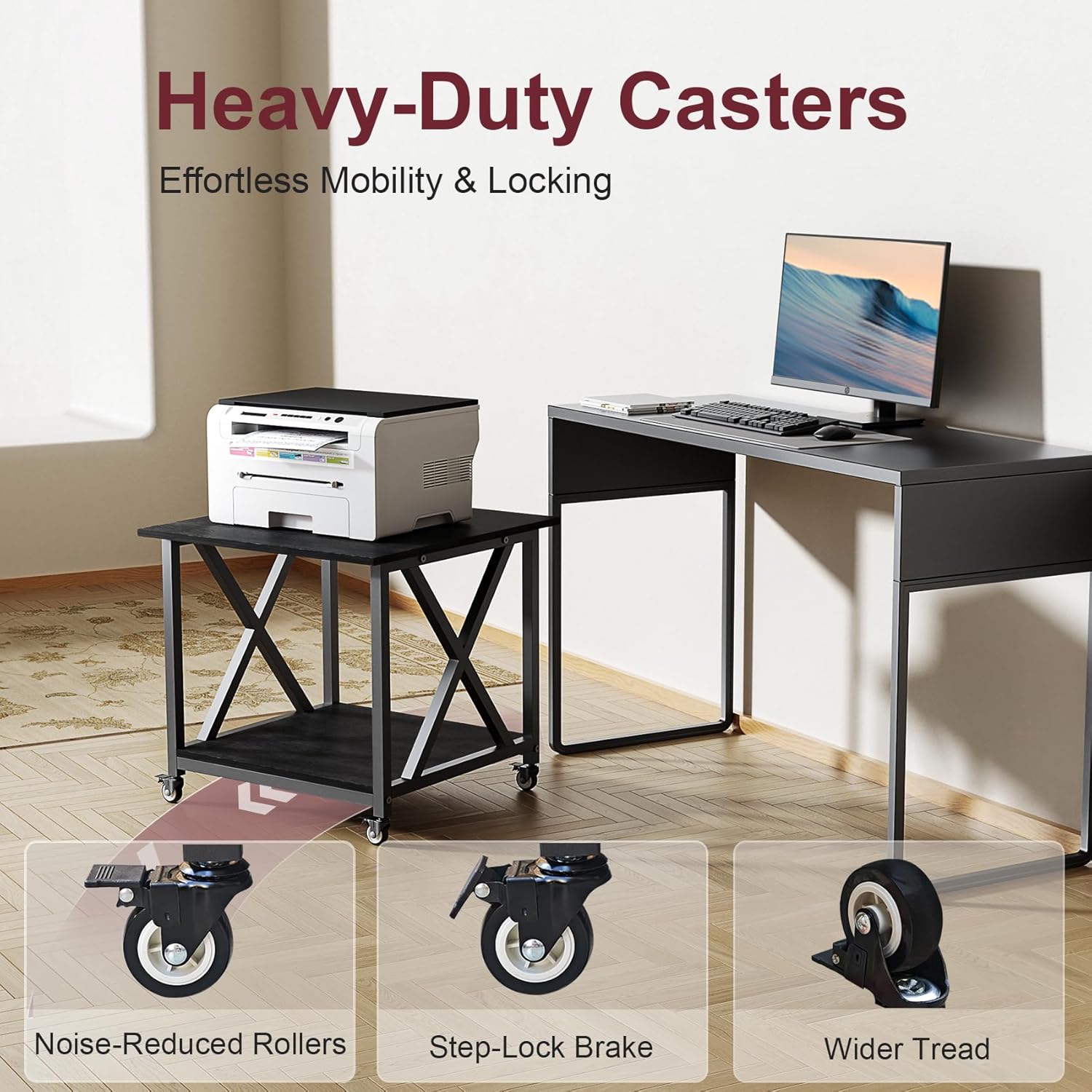 2 Tier Large Printer Stand, 23.6 x 23.6 Inches Printer Table with Storage Shelf, Rolling Printer Cart with Industrial Wheels for Home Office (Black)