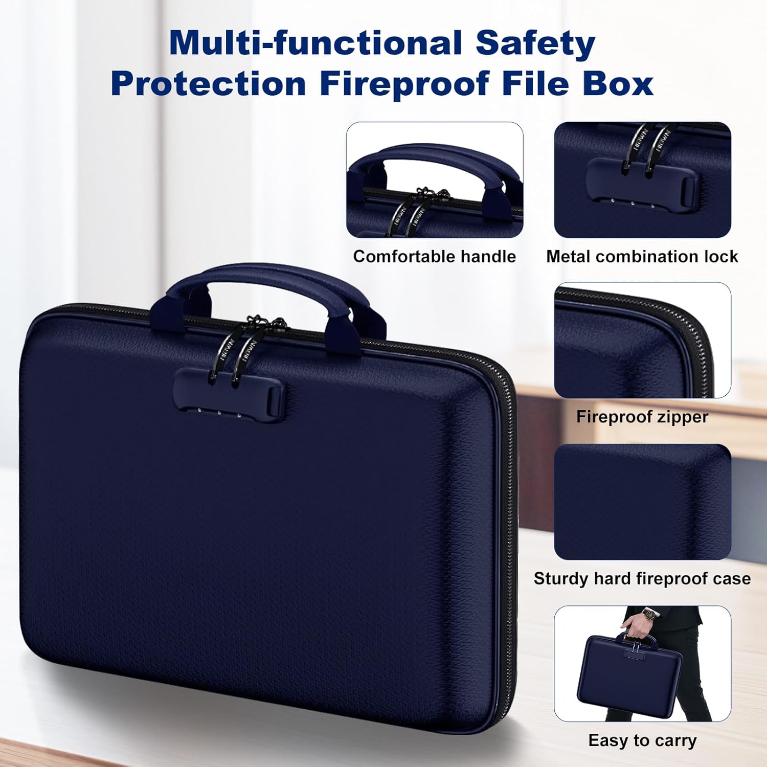 Fireproof Document Box, Hard Case Fireproof File Organizer Box with Lock and 13 Pocket Accordion File Folder, Portable Safe Box for Home Office Travel to Storage Important Documents Laptop Blue