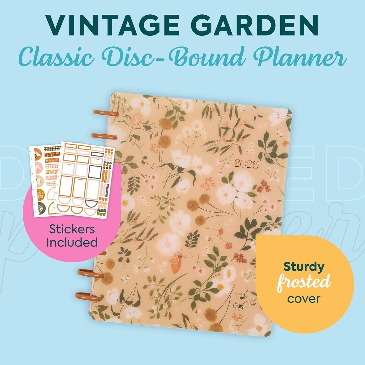 Happy Planner Disc-Bound Planner Jan.–Dec. 2026, Includes 3 Extra Months and 2 Sticker Sheets, Classic Size, 7" x 9.25", Dashboard Layout, Vintage Garden Tan