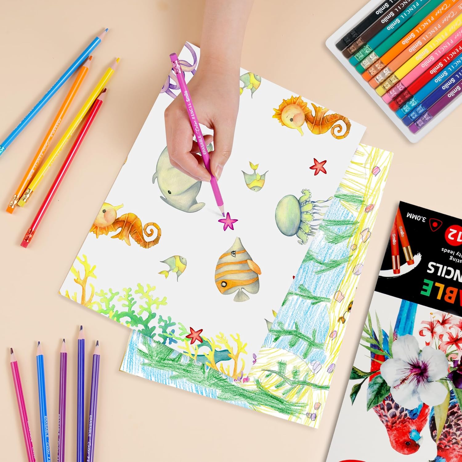 Smilo 12-Count Erasable Colored Pencils with Erasers - Vibrant & Smooth Colors for Drawing, Coloring Books, School Art Projects - Premium Art Supplies for Kids, Adults & DIY Crafts