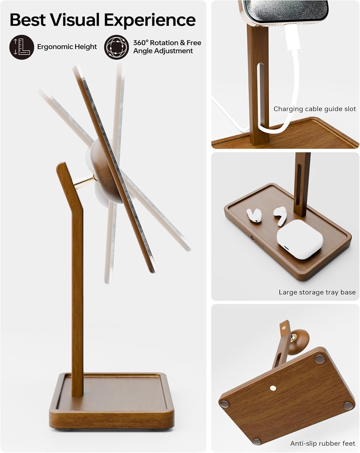 - FULL 360° ADJUSTABLE VIEWING ANGLES | Customize your setup with one-hand 360° rotation . The engineered metal ball joint allows you to smoothly position your phone for the perfect angle for FaceTime, streaming, or look in the mirror. The ergonomic design ensures a perfect view, reducing neck and eye strain.