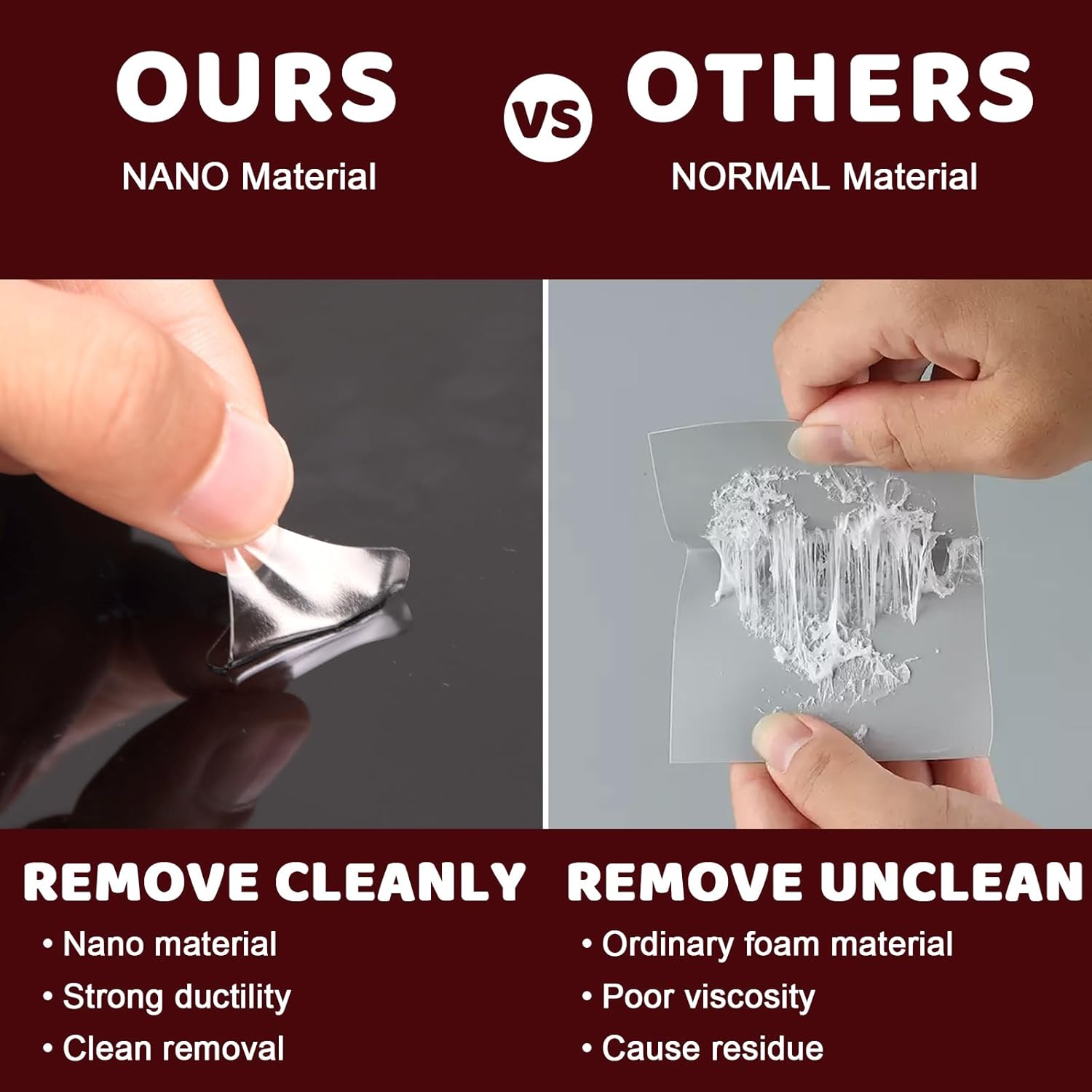 - 【Premium Soft Nano Gel – Invisible & Surface-Safe】Crafted from high-quality soft acrylic nano gel, this nano double sided adhesive tape is flexible, tear-resistant, and virtually invisible when applied. It adheres seamlessly to textured, curved, or smooth materials like glass, fabric, ceramic, and wood. Compared to double sided sticky putty or double sided tape for walls no damage, our nano tape double sided design offers a softer, more refined finish for delicate surfaces.