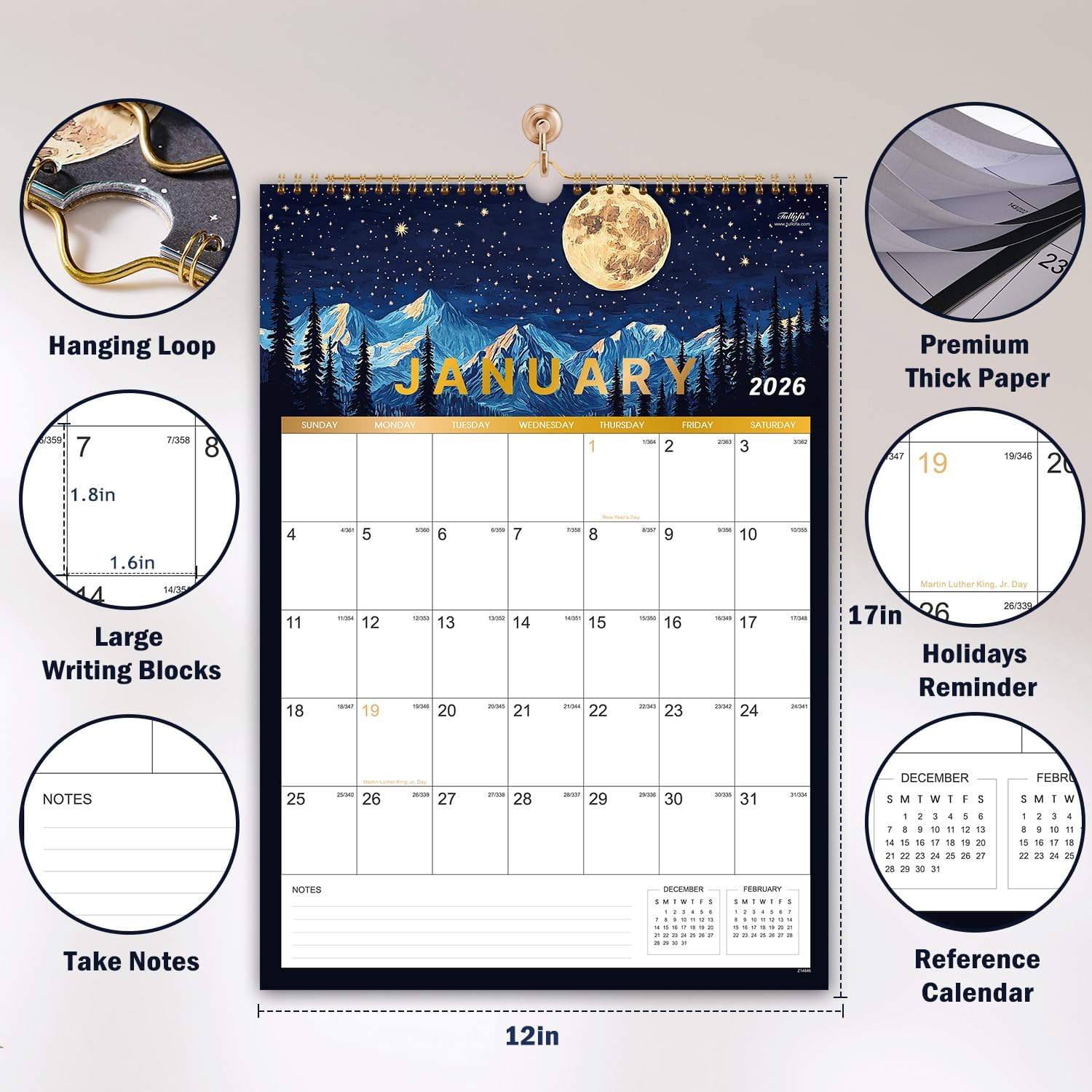 - š² FUNCTIONAL DETAILS - Sturdy golden twin-wire binding for turning pages easily + Unruled daily blocks + Hanging Hole + Premium thick paper for comfortable writing and stored for a long time + Hard cover on the back this large wall calendar 2026 to protect your 2026 large calendar well.