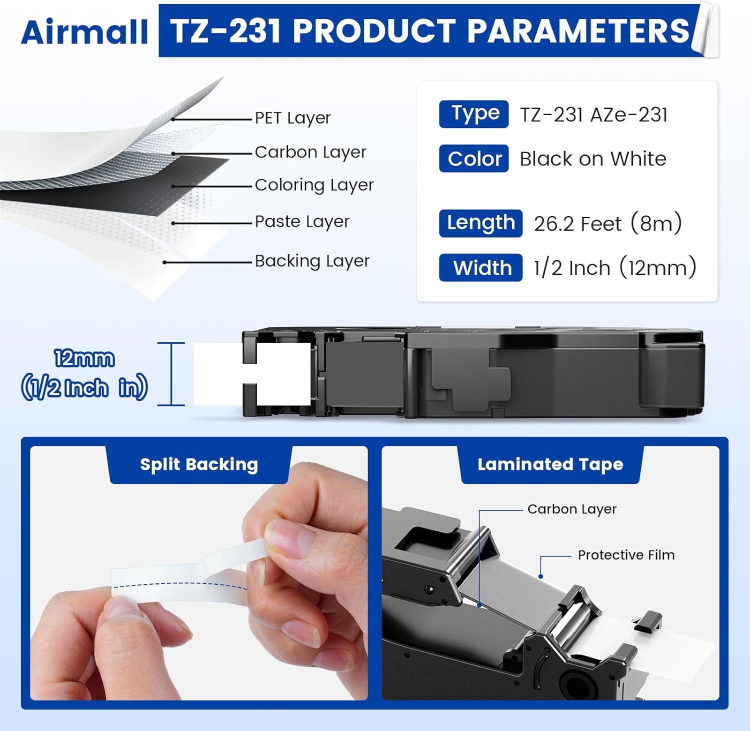 Airmall Tze 12mm 0.47 Laminated White Label Maker Tape Refill Compatible with Brother 12mm .47 Laminated White Tz Tape TZe-231 TZ-231 for PT-D200 D210 D220 H110 D410 P710BT 1750 1180, 20Pack